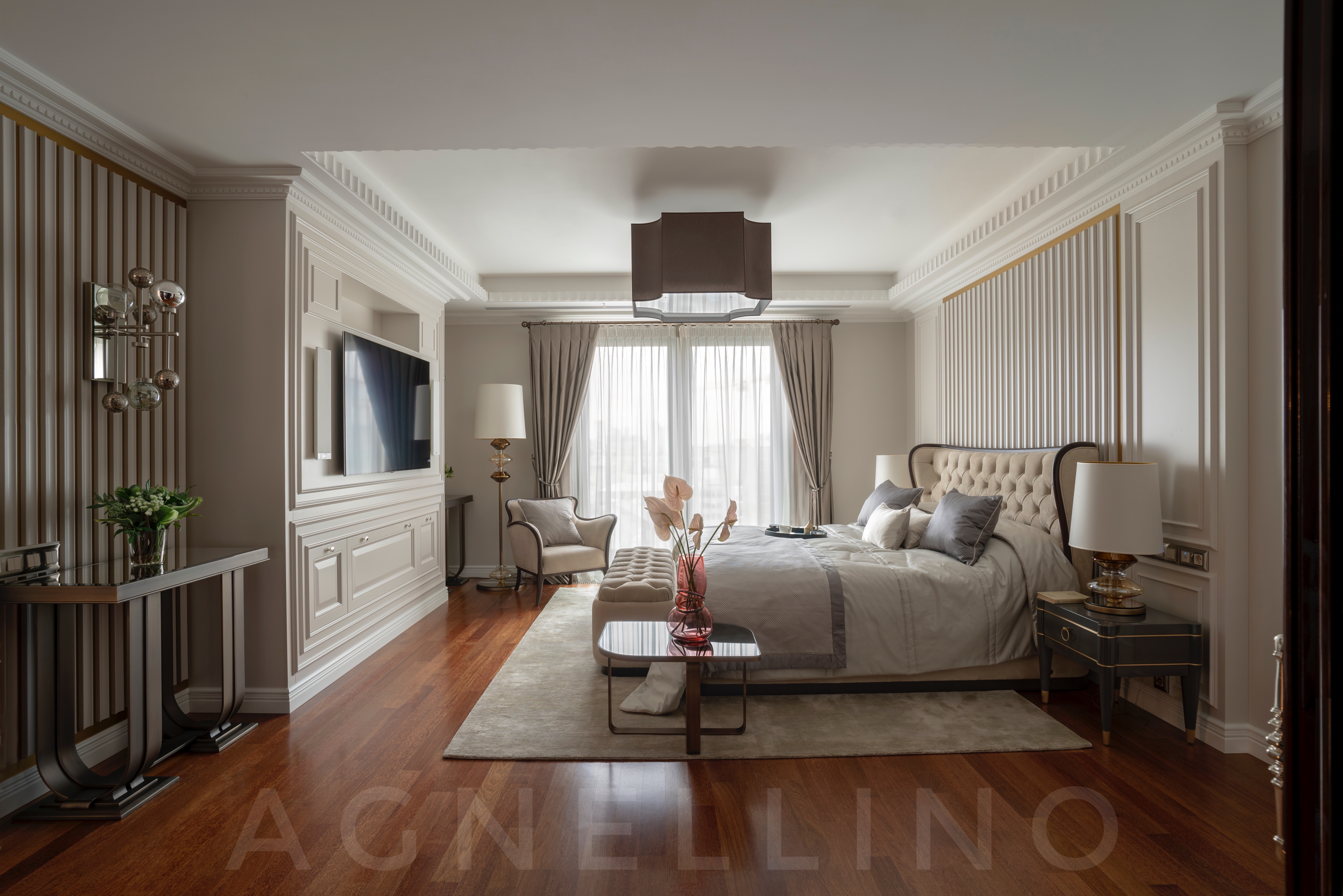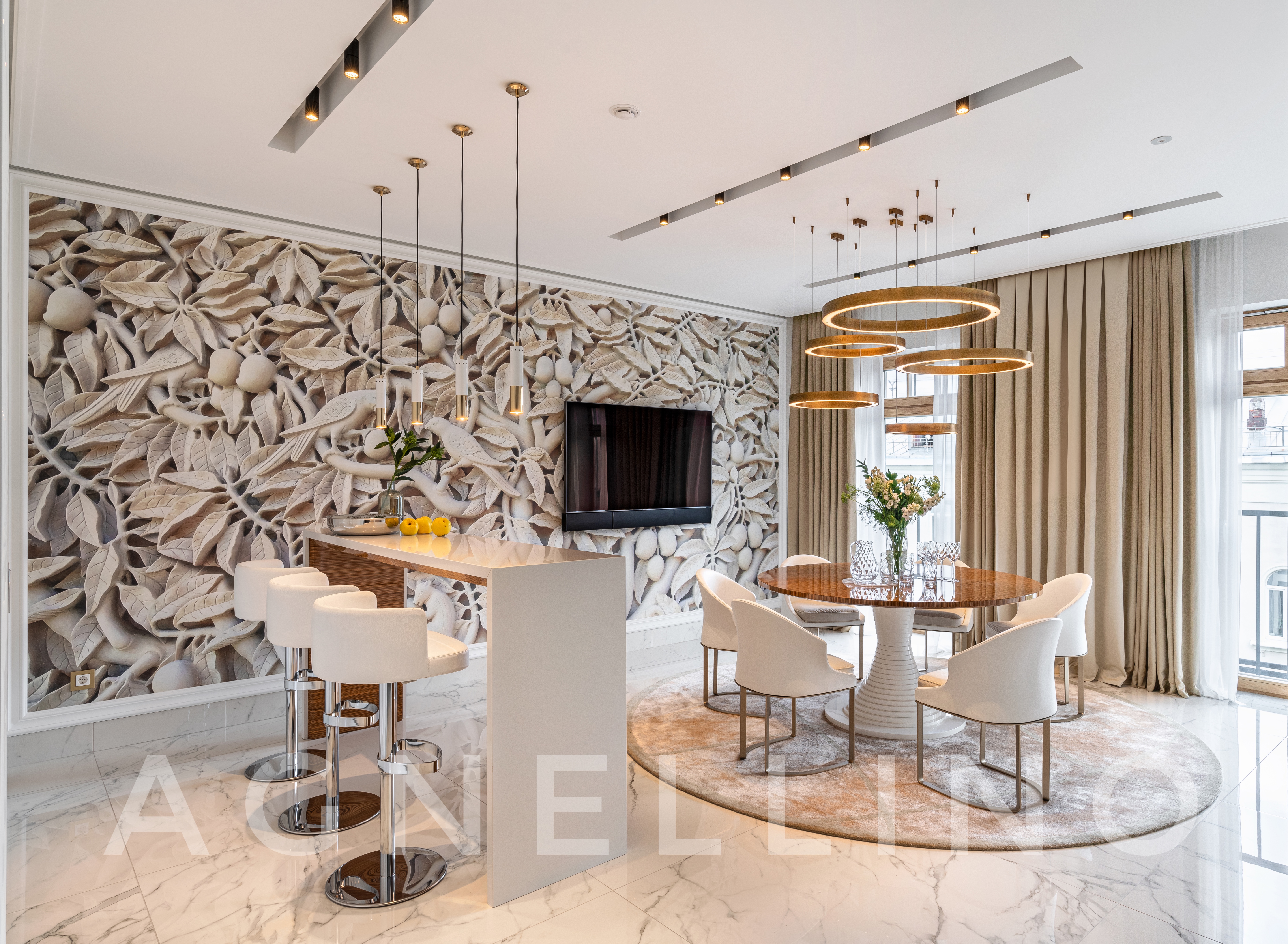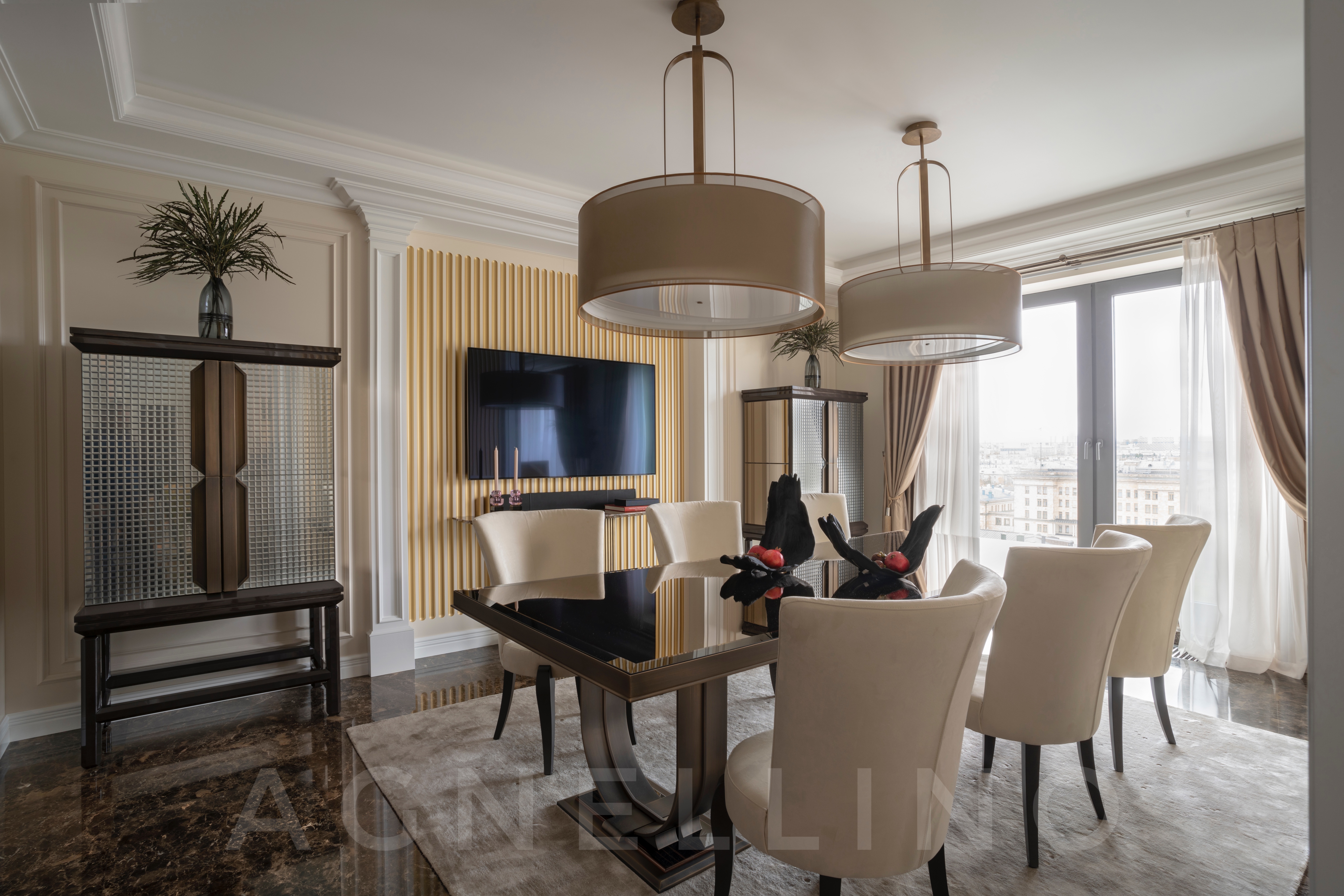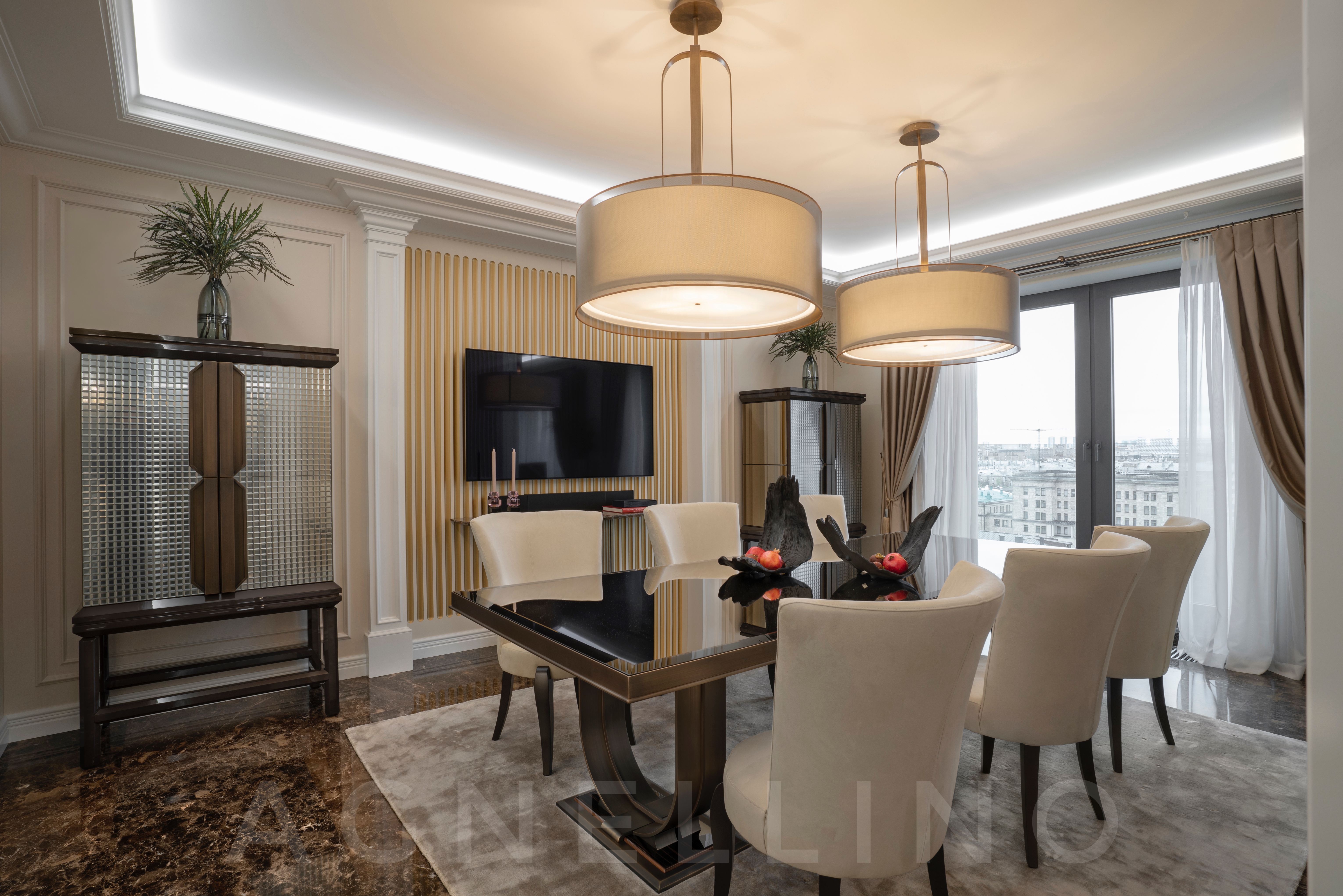 При создании интерьера ставилась задача совместить элегантный шик и достойную роскошь в духе Америки, вдохновившись работами дизайнеров Жана Луи Денио, Томаса Физанта, Келли Хоппен…