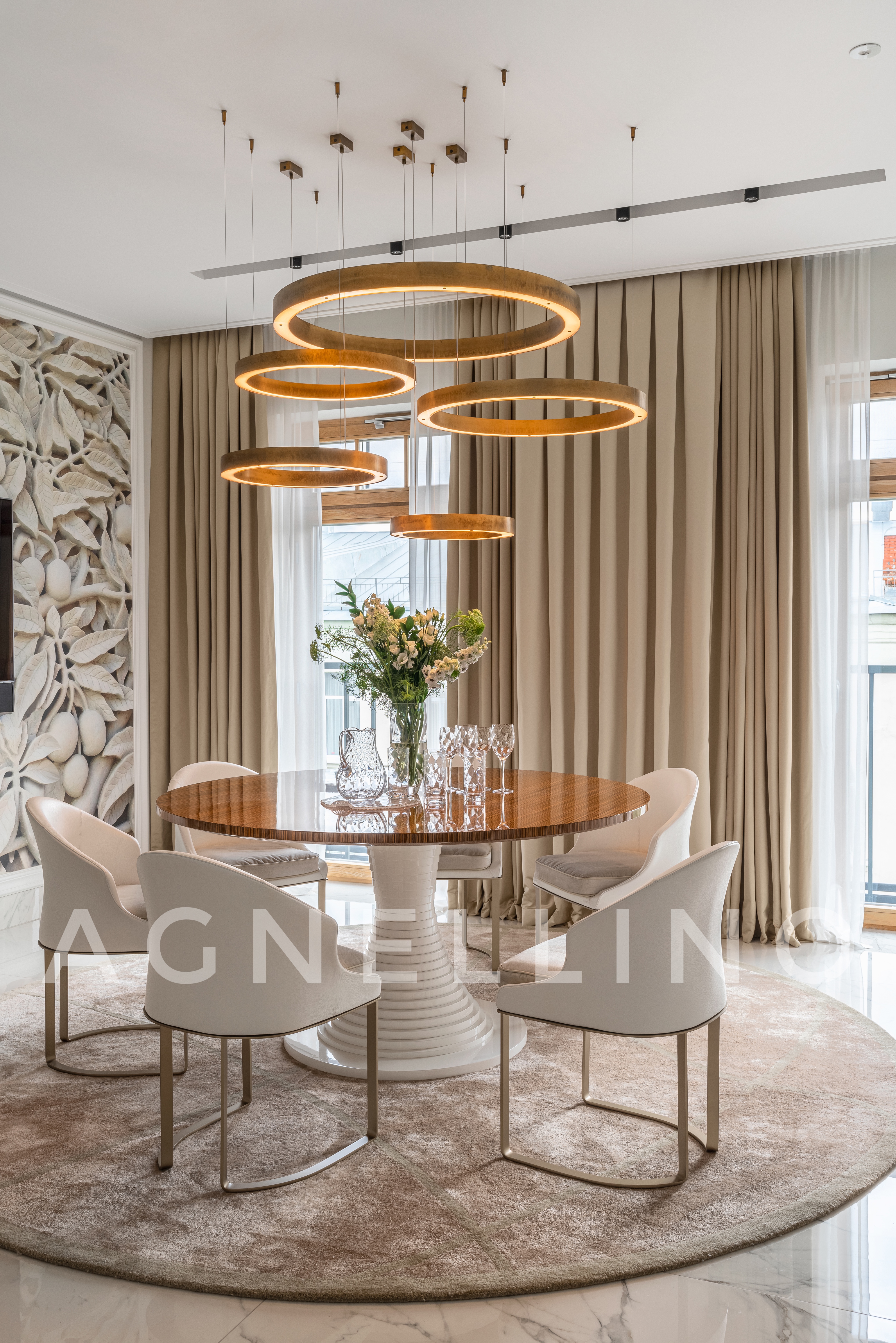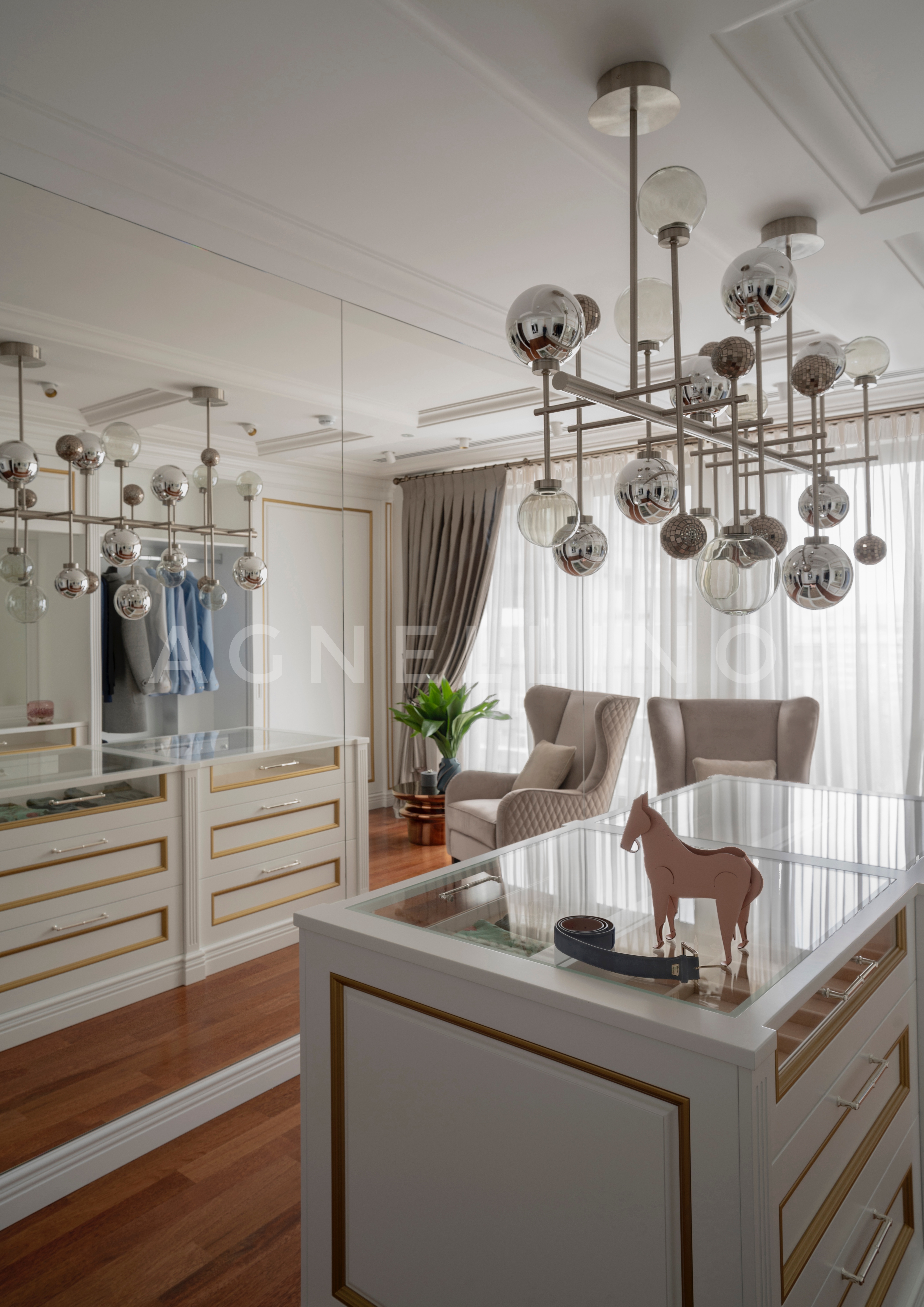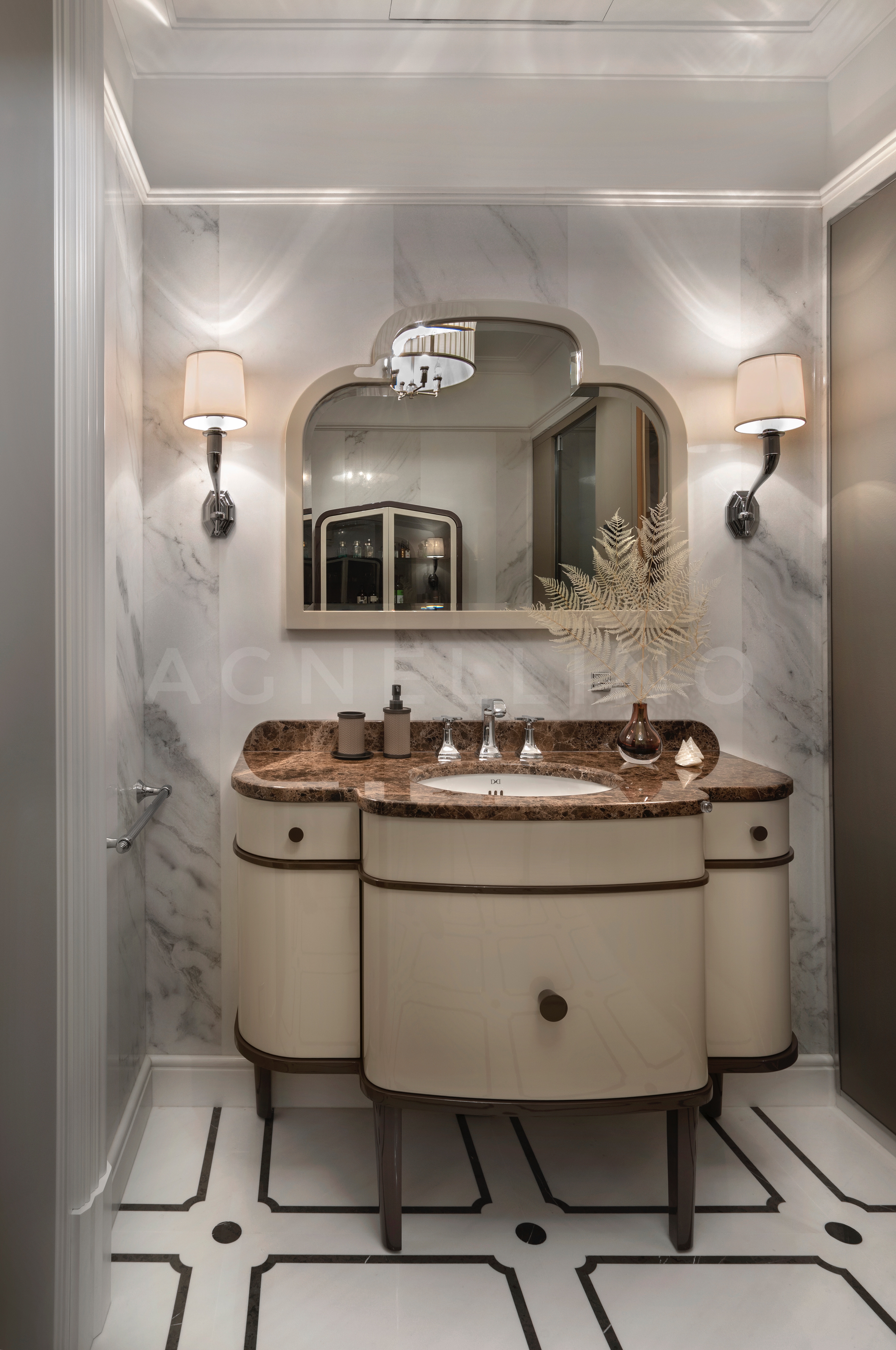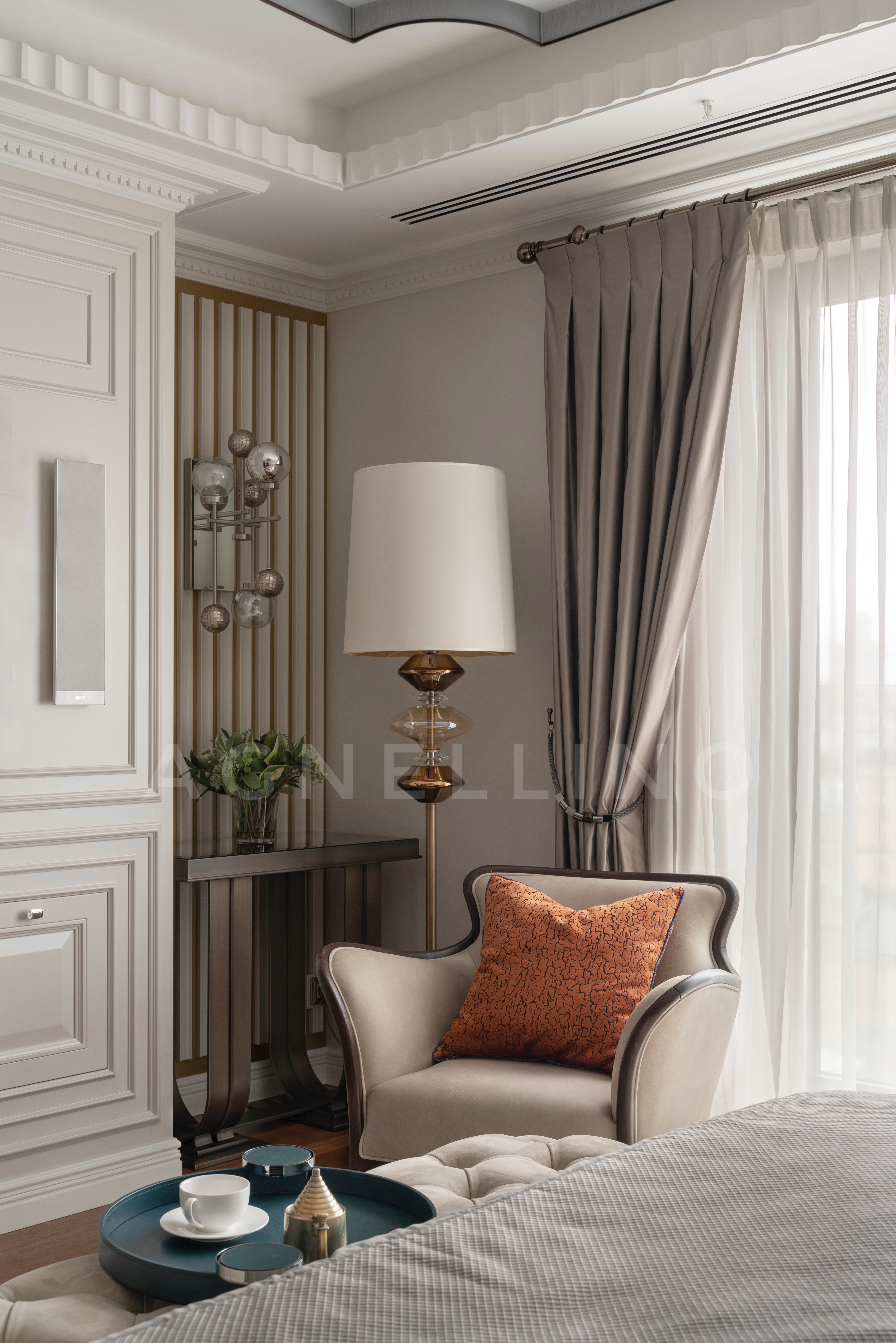 При создании интерьера ставилась задача совместить элегантный шик и достойную роскошь в духе Америки, вдохновившись работами дизайнеров Жана Луи Денио, Томаса Физанта, Келли Хоппен…