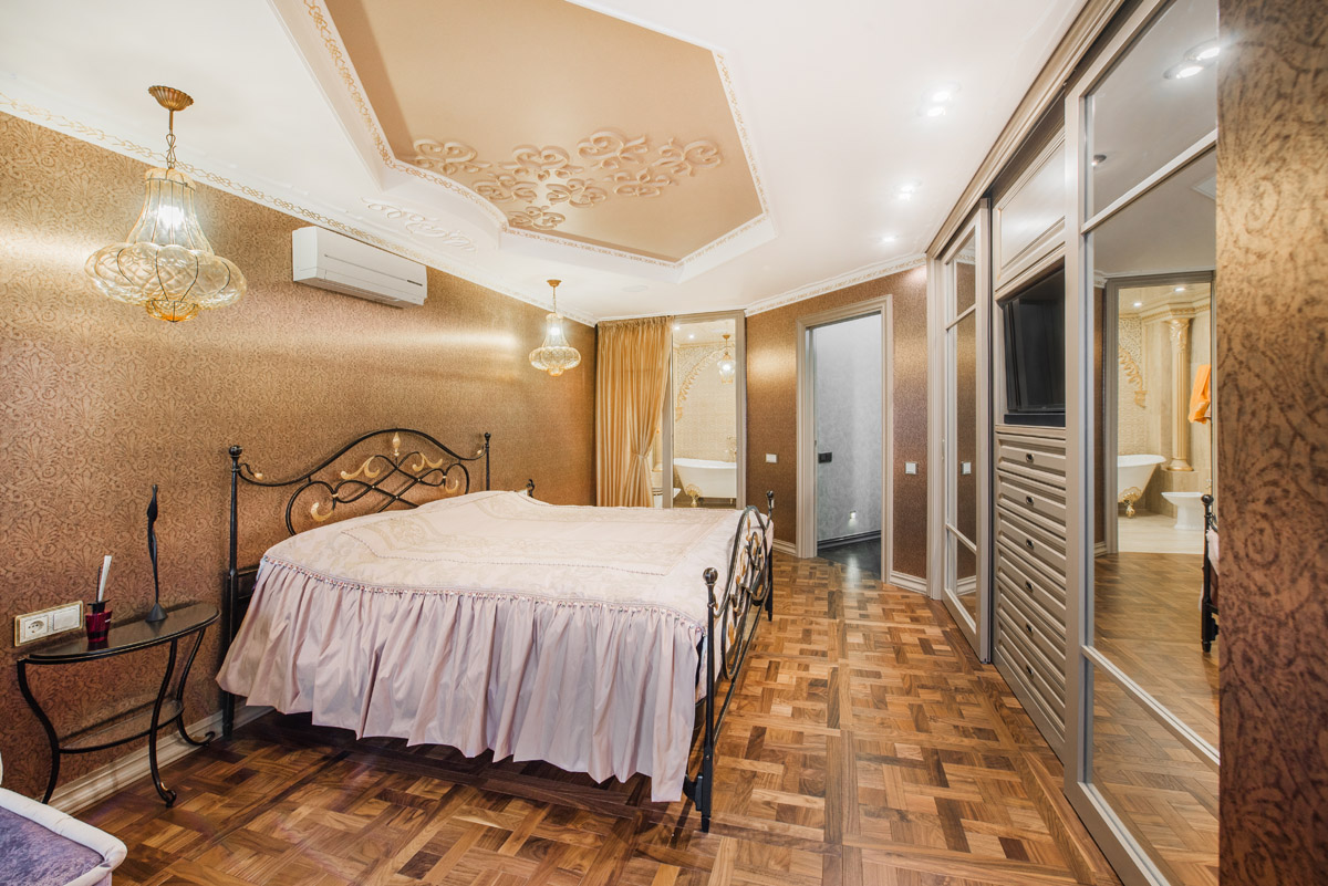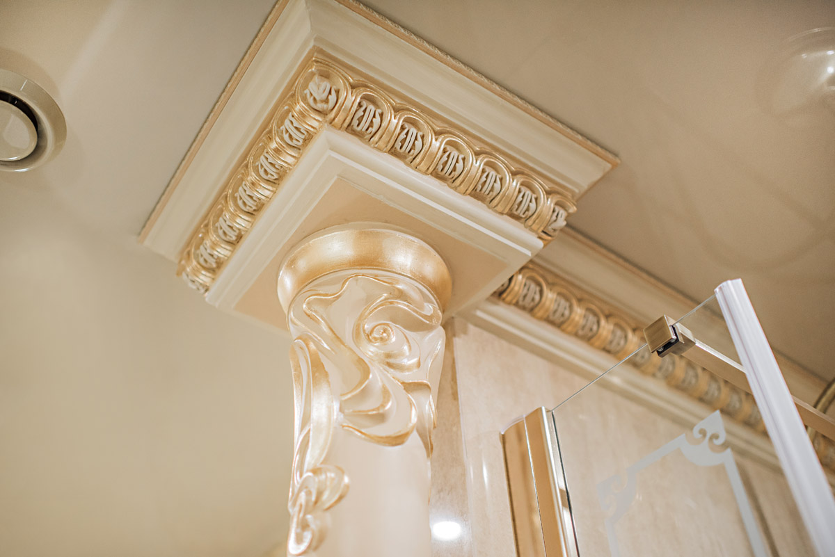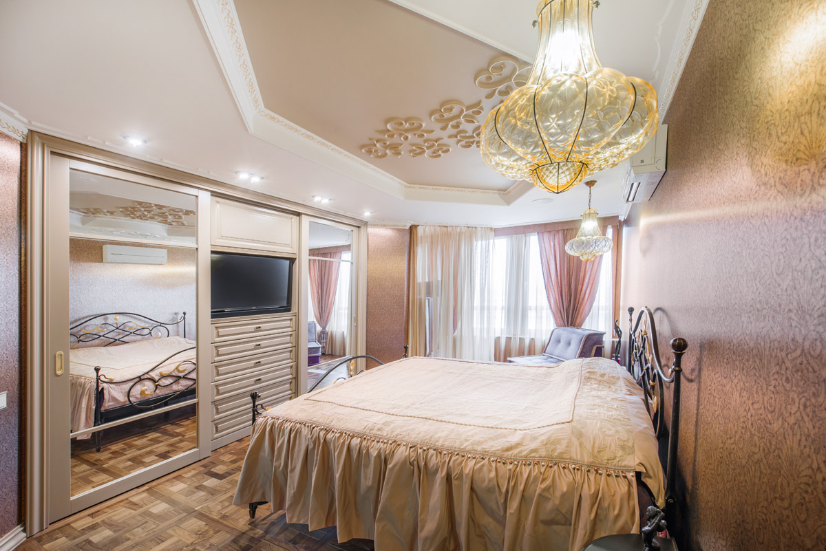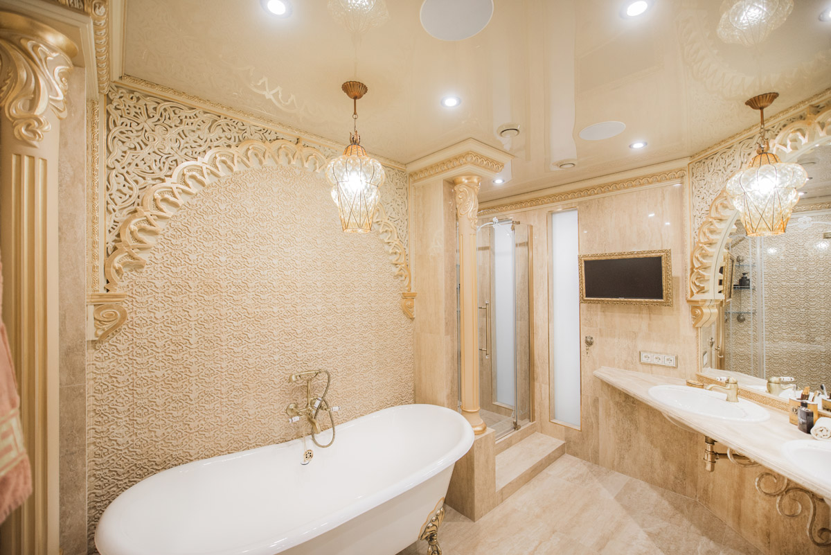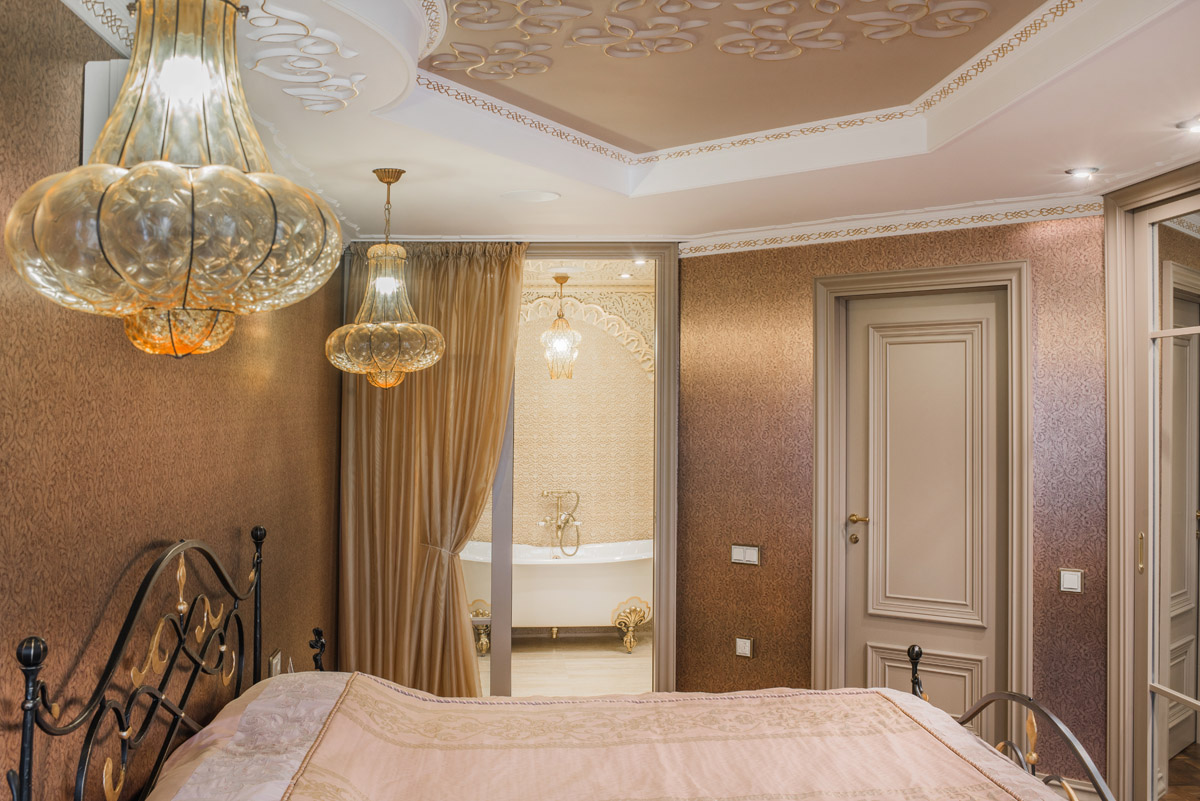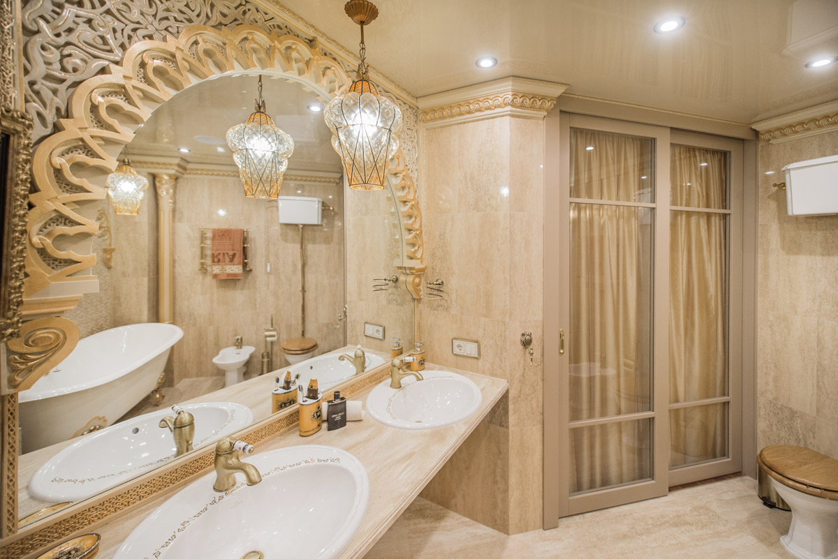 Цвета подобраны соответственно: золотой, шоколадный, слоновая кость, жемчужно-серые оттенки. Симметрия линий, баланс и гармония форм, симбиоз текстур хрусталя, бронзы, набука, шелка, лакированного дерева, оникса и мрамора. Интерьер апартаментов выполнен в классическом стиле: просторная гостиная с каминной зоной, столовая и отдельная кухня в стиле роскошных яхтенных интерьеров. Большая светлая спальня имеет отдельную гардеробную, ванную комнату и СПА-зону, украшенную большим панно с вышивкой в восточном духе. И особая роль здесь отводится работе с декоративным камнем: оникс с подсветкой, узоры из эмперадора на полу, сложные решения из каррарского мрамора и травертина в СПА-зоне и ванной комнате.