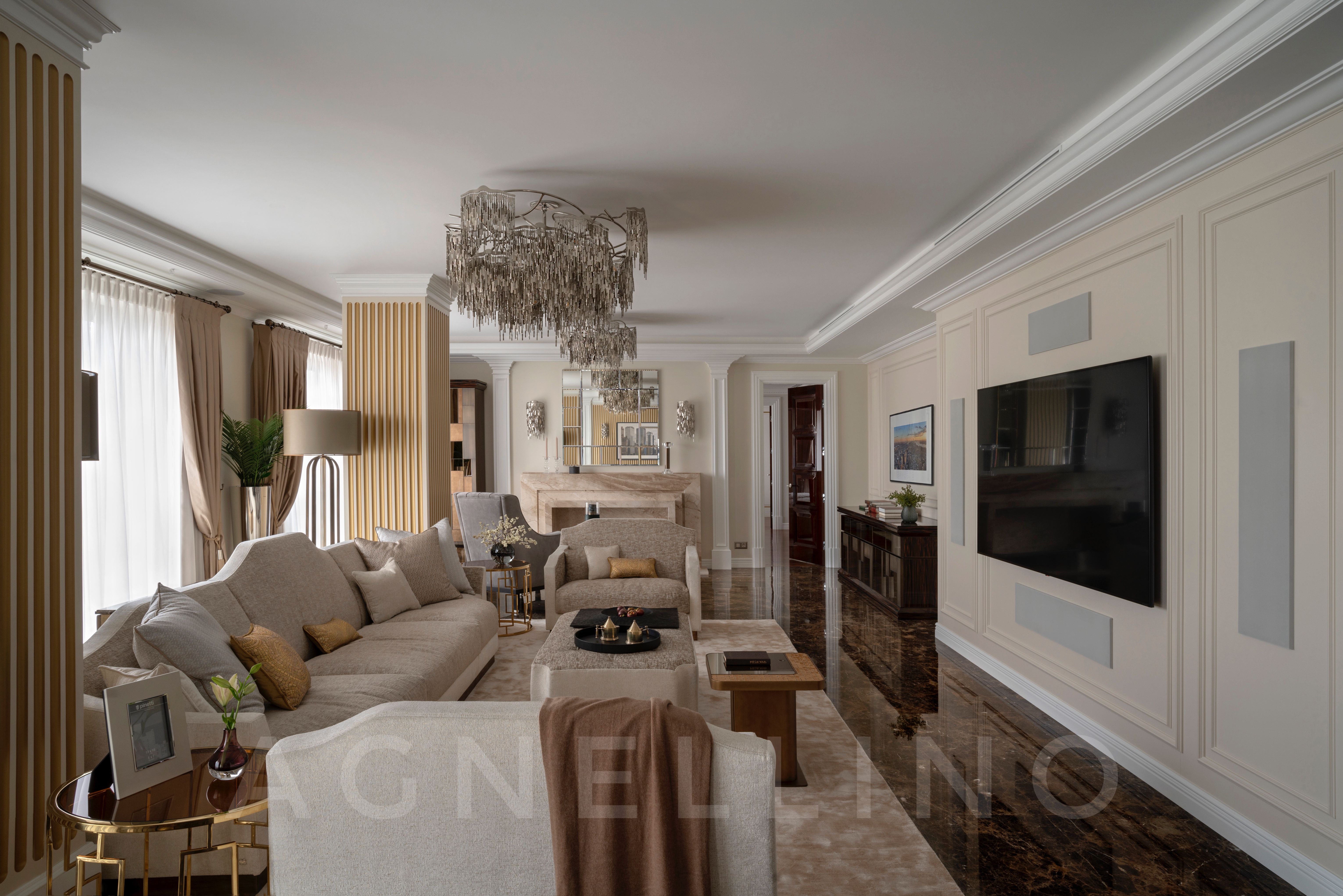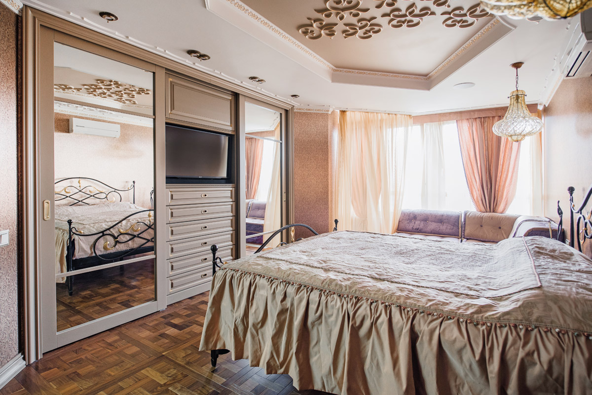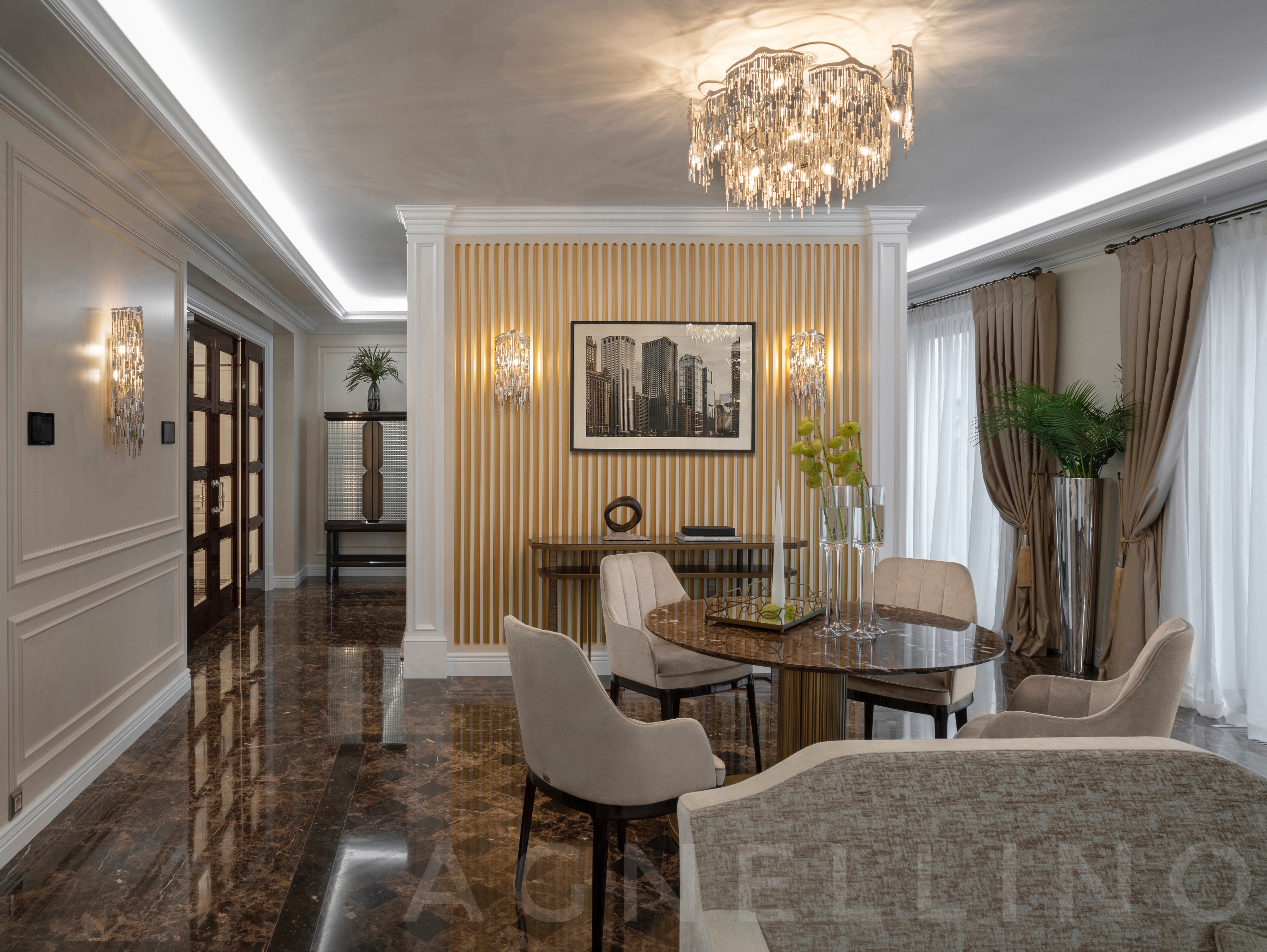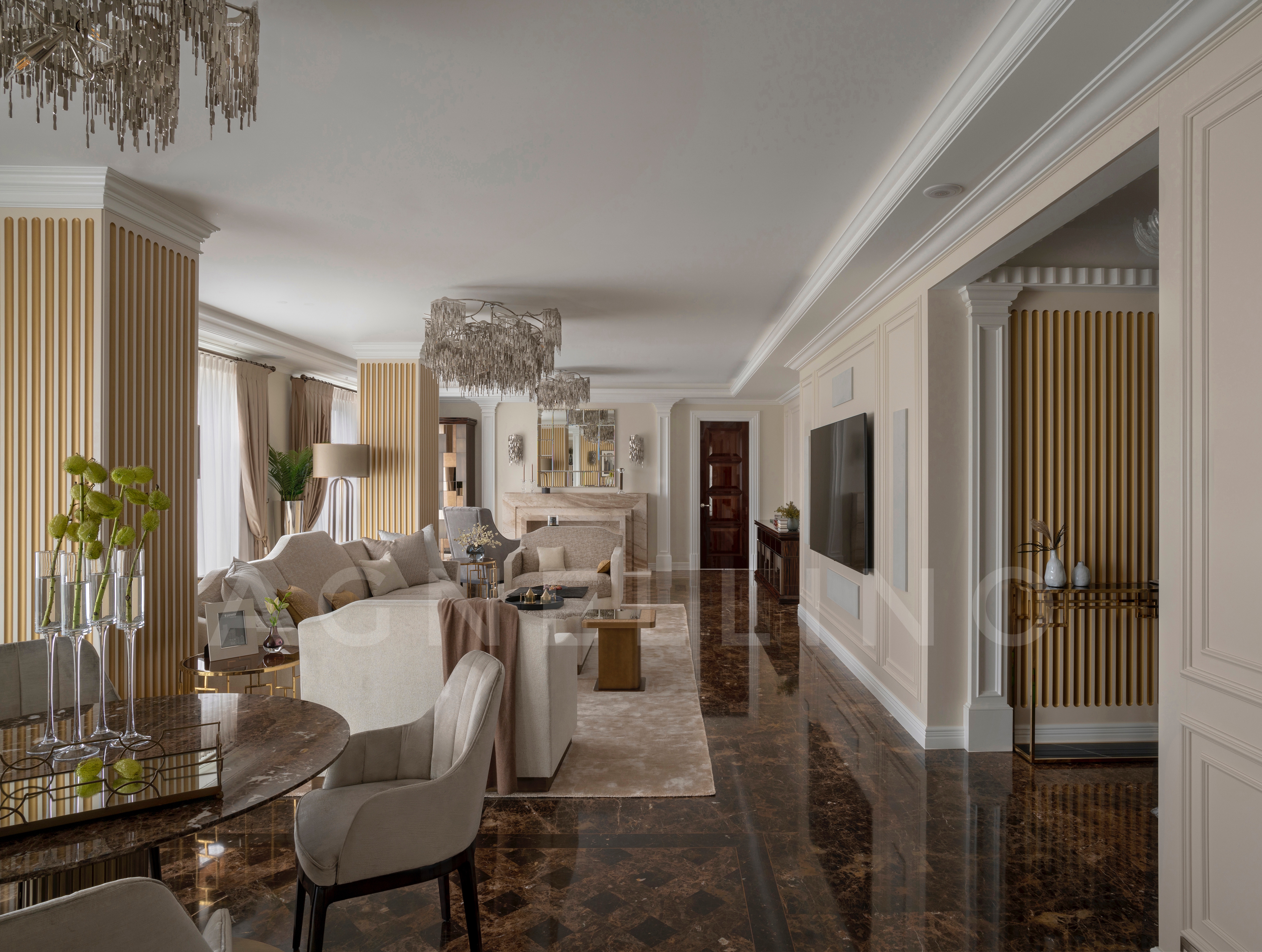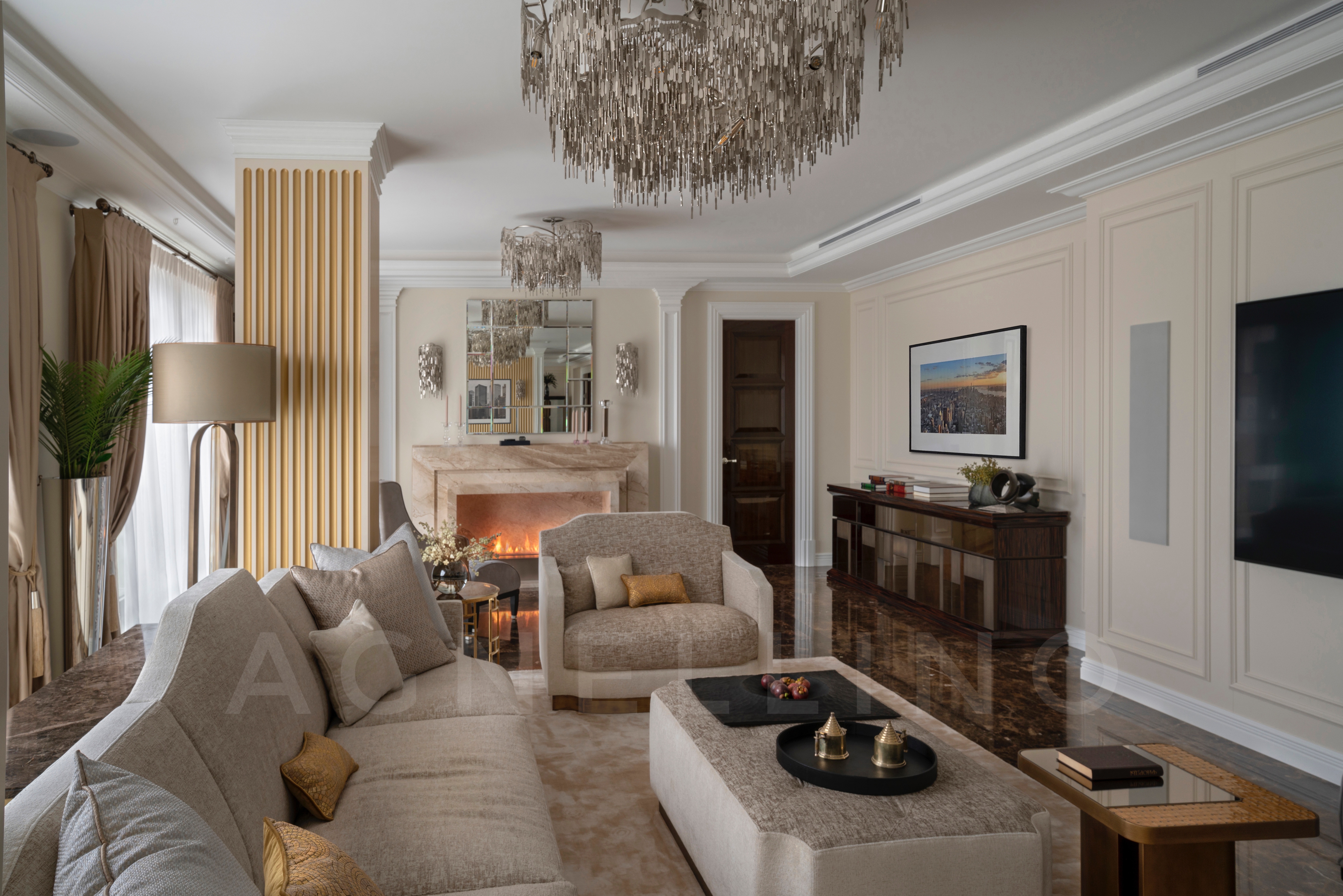 Цвета подобраны соответственно: золотой, шоколадный, слоновая кость, жемчужно-серые оттенки. Симметрия линий, баланс и гармония форм, симбиоз текстур хрусталя, бронзы, набука, шелка, лакированного дерева, оникса и мрамора. Интерьер апартаментов выполнен в классическом стиле: просторная гостиная с каминной зоной, столовая и отдельная кухня в стиле роскошных яхтенных интерьеров. Большая светлая спальня имеет отдельную гардеробную, ванную комнату и СПА-зону, украшенную большим панно с вышивкой в восточном духе. И особая роль здесь отводится работе с декоративным камнем: оникс с подсветкой, узоры из эмперадора на полу, сложные решения из каррарского мрамора и травертина в СПА-зоне и ванной комнате.