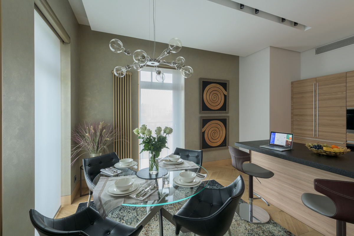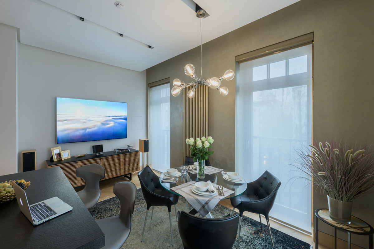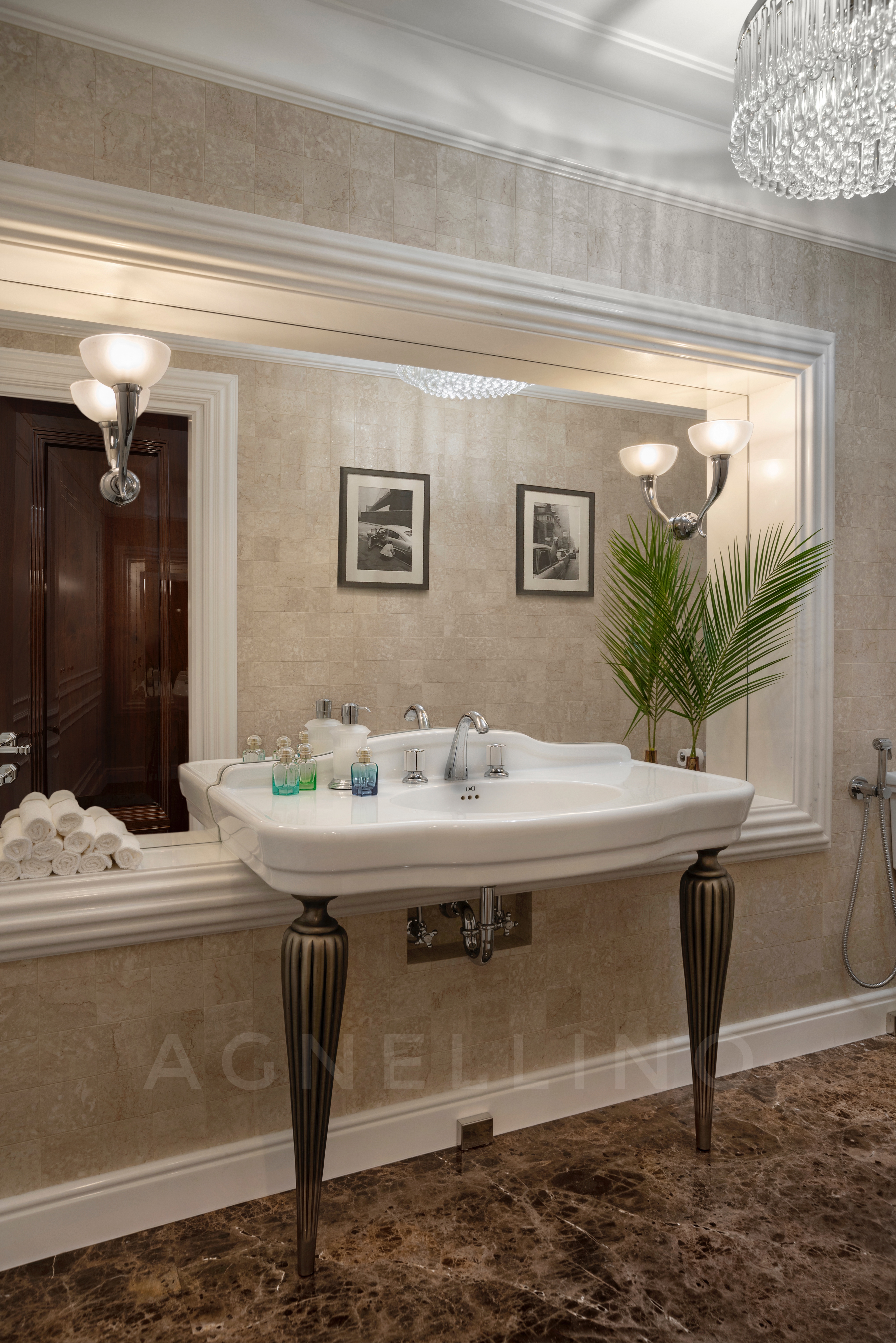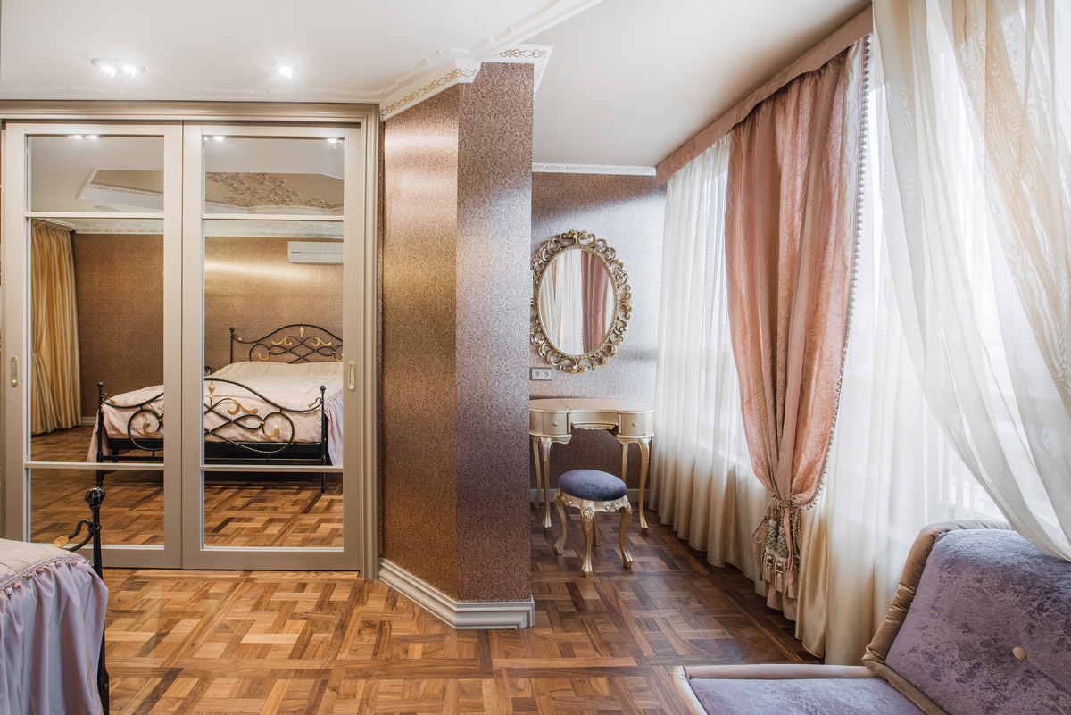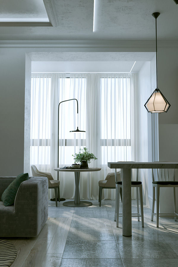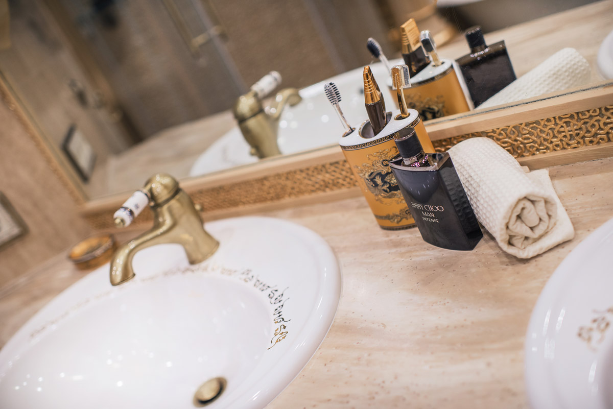 Цвета подобраны соответственно: золотой, шоколадный, слоновая кость, жемчужно-серые оттенки. Симметрия линий, баланс и гармония форм, симбиоз текстур хрусталя, бронзы, набука, шелка, лакированного дерева, оникса и мрамора. Интерьер апартаментов выполнен в классическом стиле: просторная гостиная с каминной зоной, столовая и отдельная кухня в стиле роскошных яхтенных интерьеров. Большая светлая спальня имеет отдельную гардеробную, ванную комнату и СПА-зону, украшенную большим панно с вышивкой в восточном духе. И особая роль здесь отводится работе с декоративным камнем: оникс с подсветкой, узоры из эмперадора на полу, сложные решения из каррарского мрамора и травертина в СПА-зоне и ванной комнате.