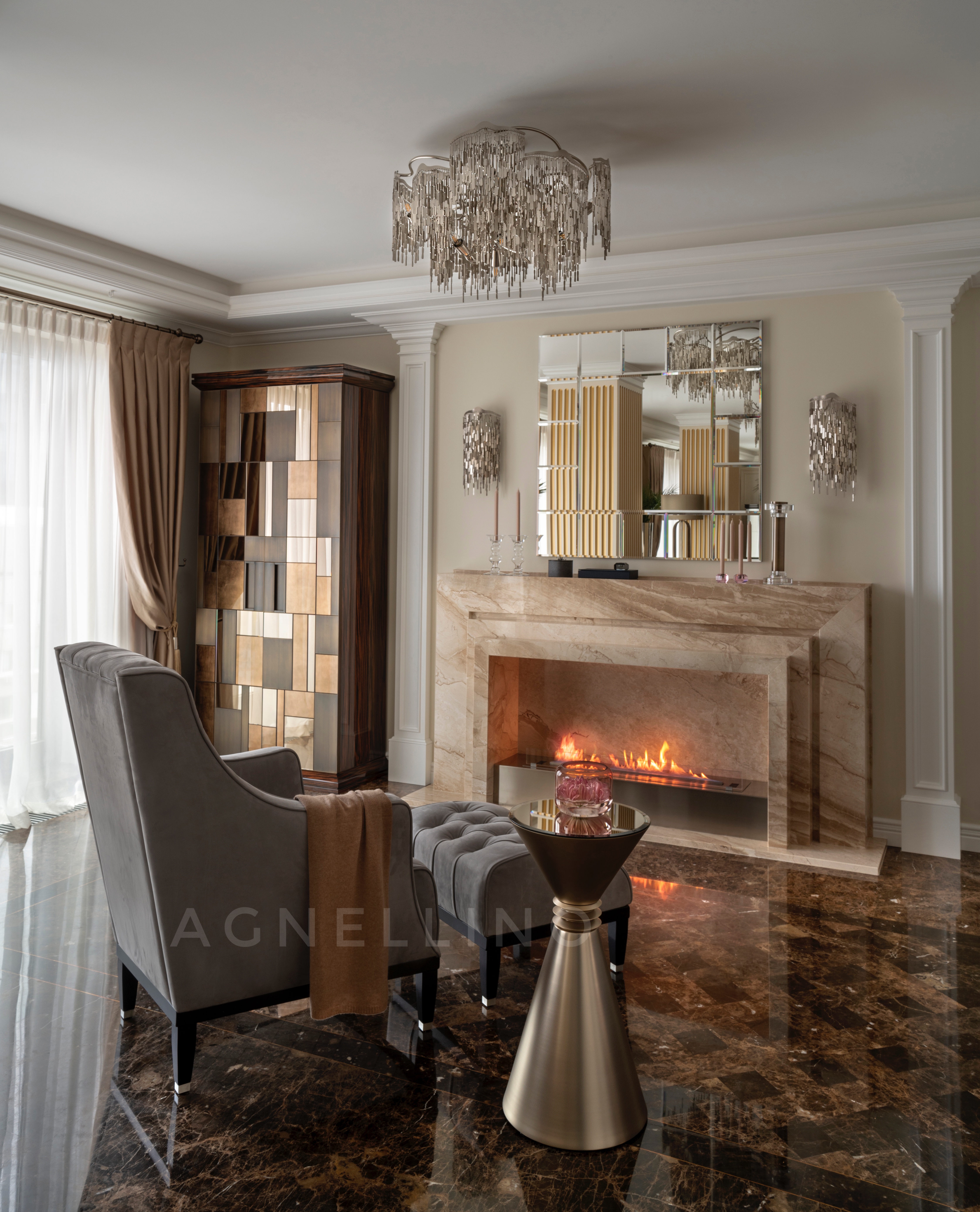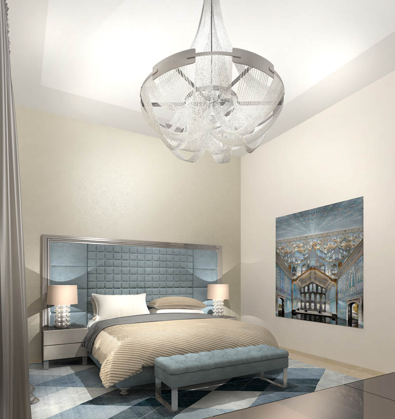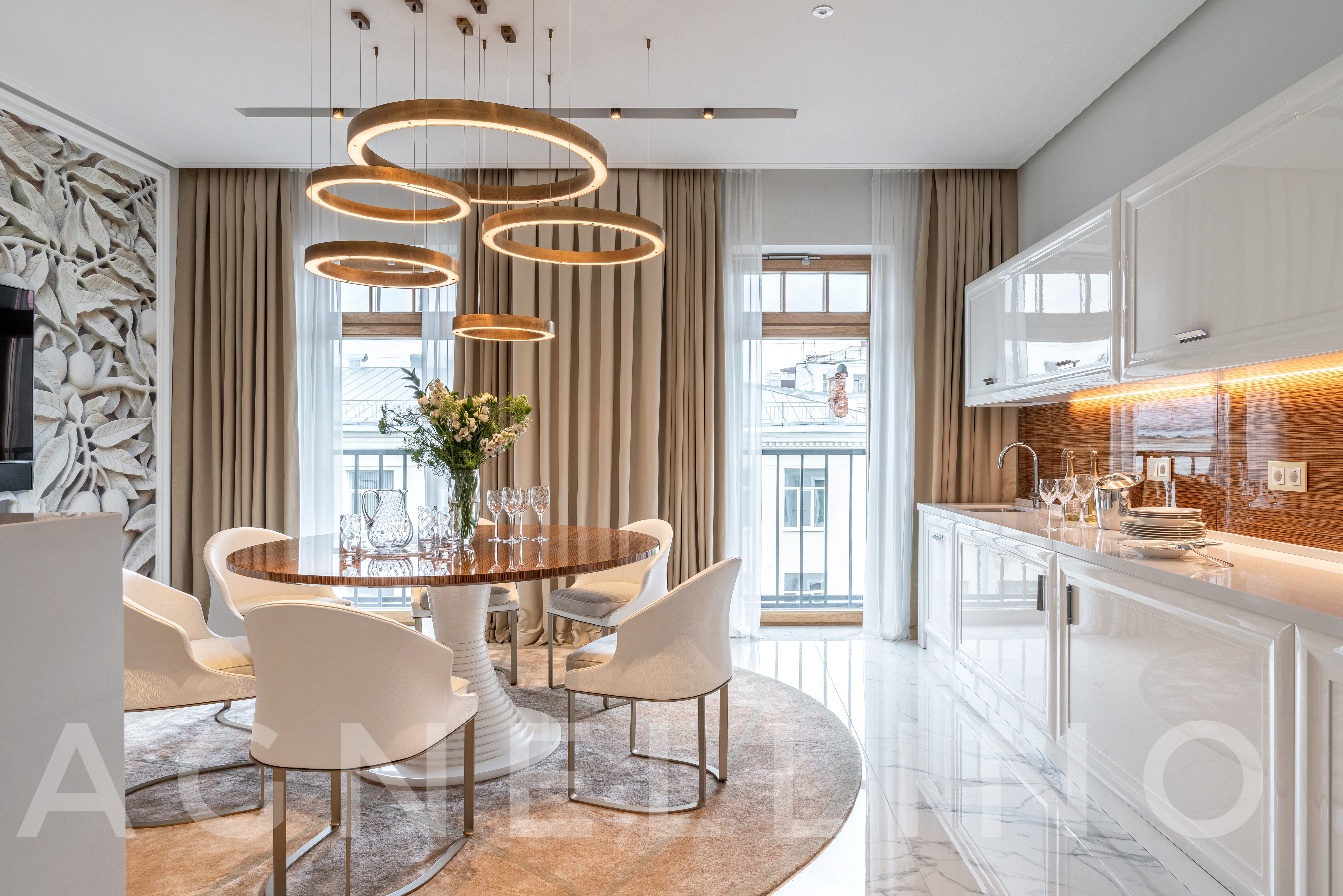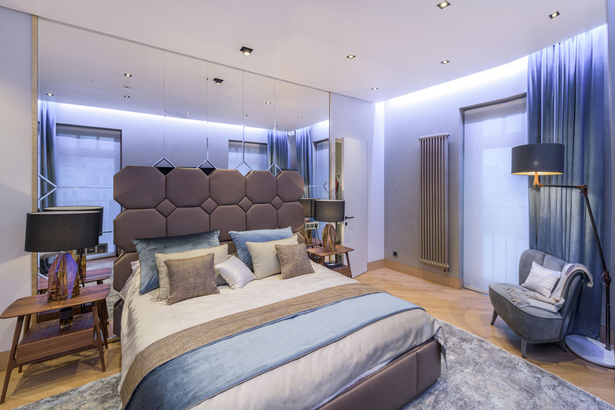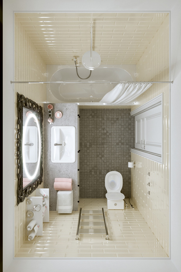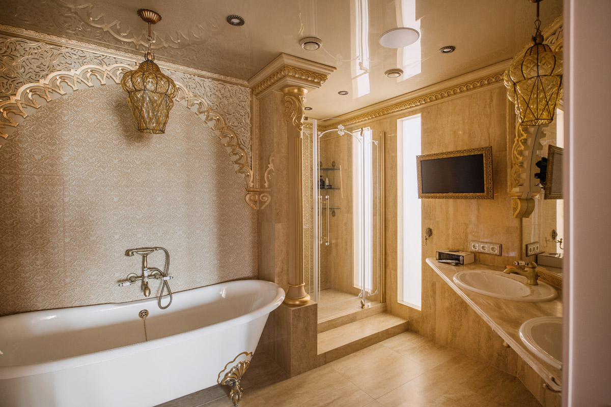 Цвета подобраны соответственно: золотой, шоколадный, слоновая кость, жемчужно-серые оттенки. Симметрия линий, баланс и гармония форм, симбиоз текстур хрусталя, бронзы, набука, шелка, лакированного дерева, оникса и мрамора. Интерьер апартаментов выполнен в классическом стиле: просторная гостиная с каминной зоной, столовая и отдельная кухня в стиле роскошных яхтенных интерьеров. Большая светлая спальня имеет отдельную гардеробную, ванную комнату и СПА-зону, украшенную большим панно с вышивкой в восточном духе. И особая роль здесь отводится работе с декоративным камнем: оникс с подсветкой, узоры из эмперадора на полу, сложные решения из каррарского мрамора и травертина в СПА-зоне и ванной комнате.