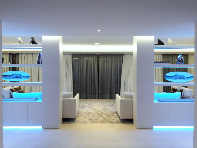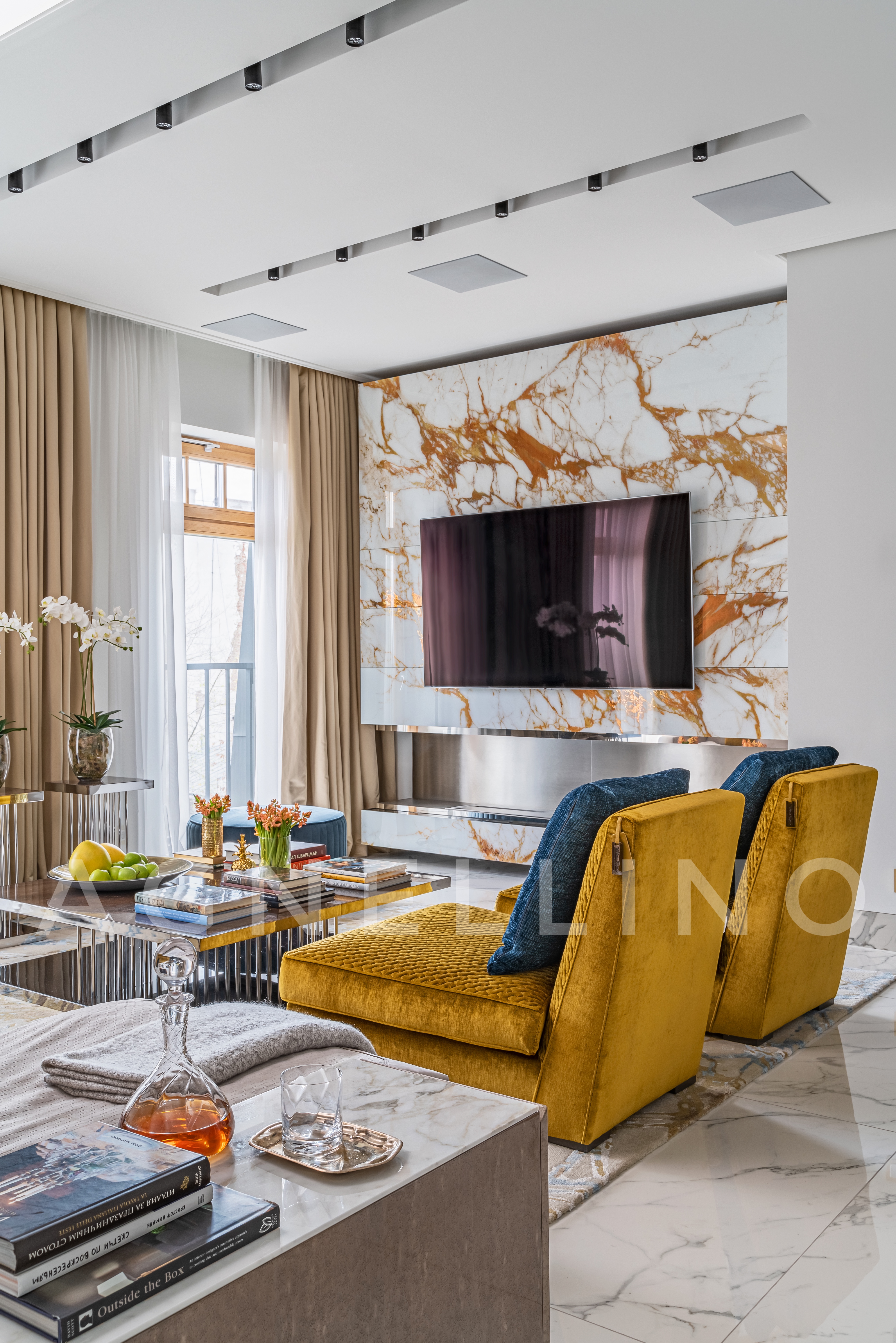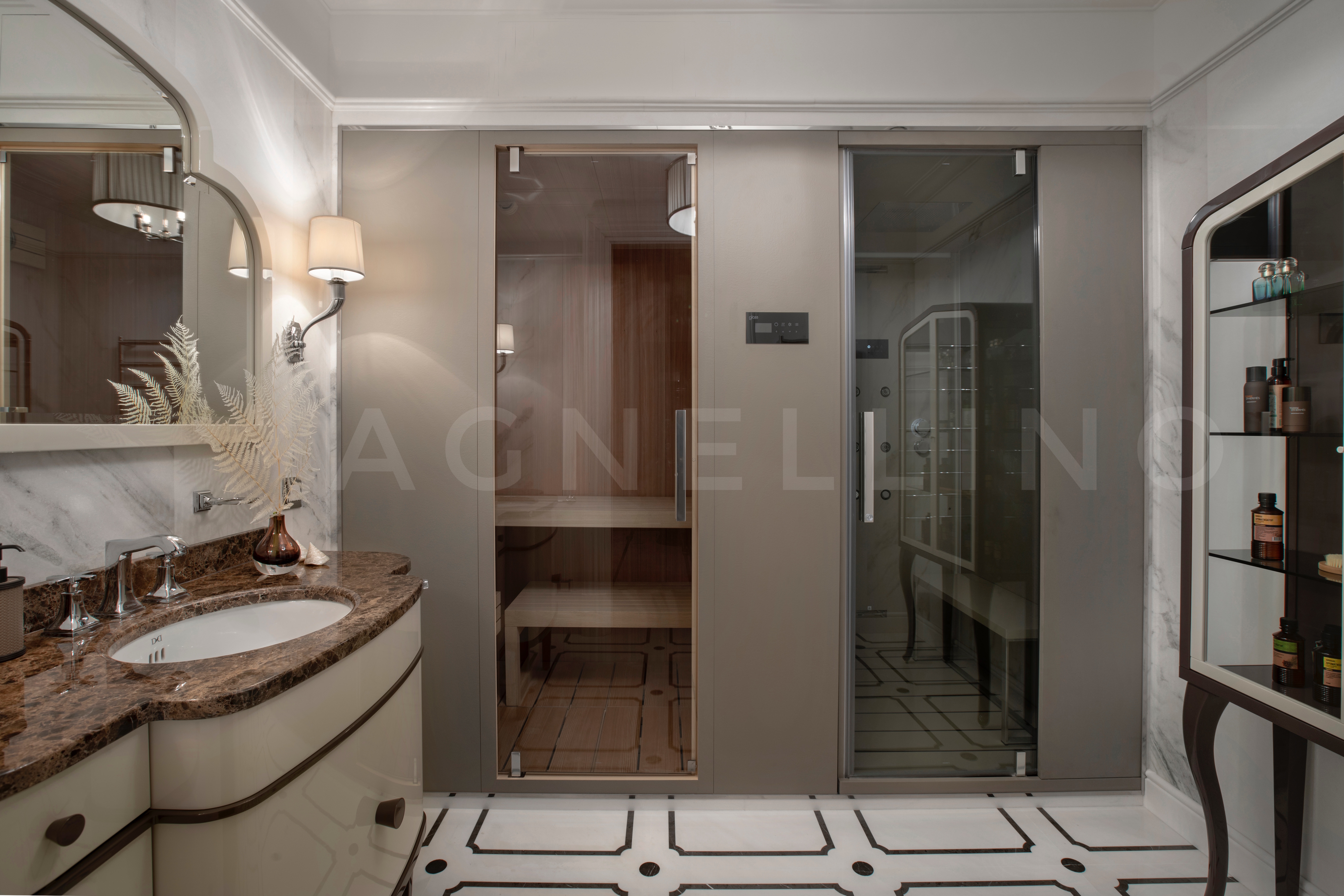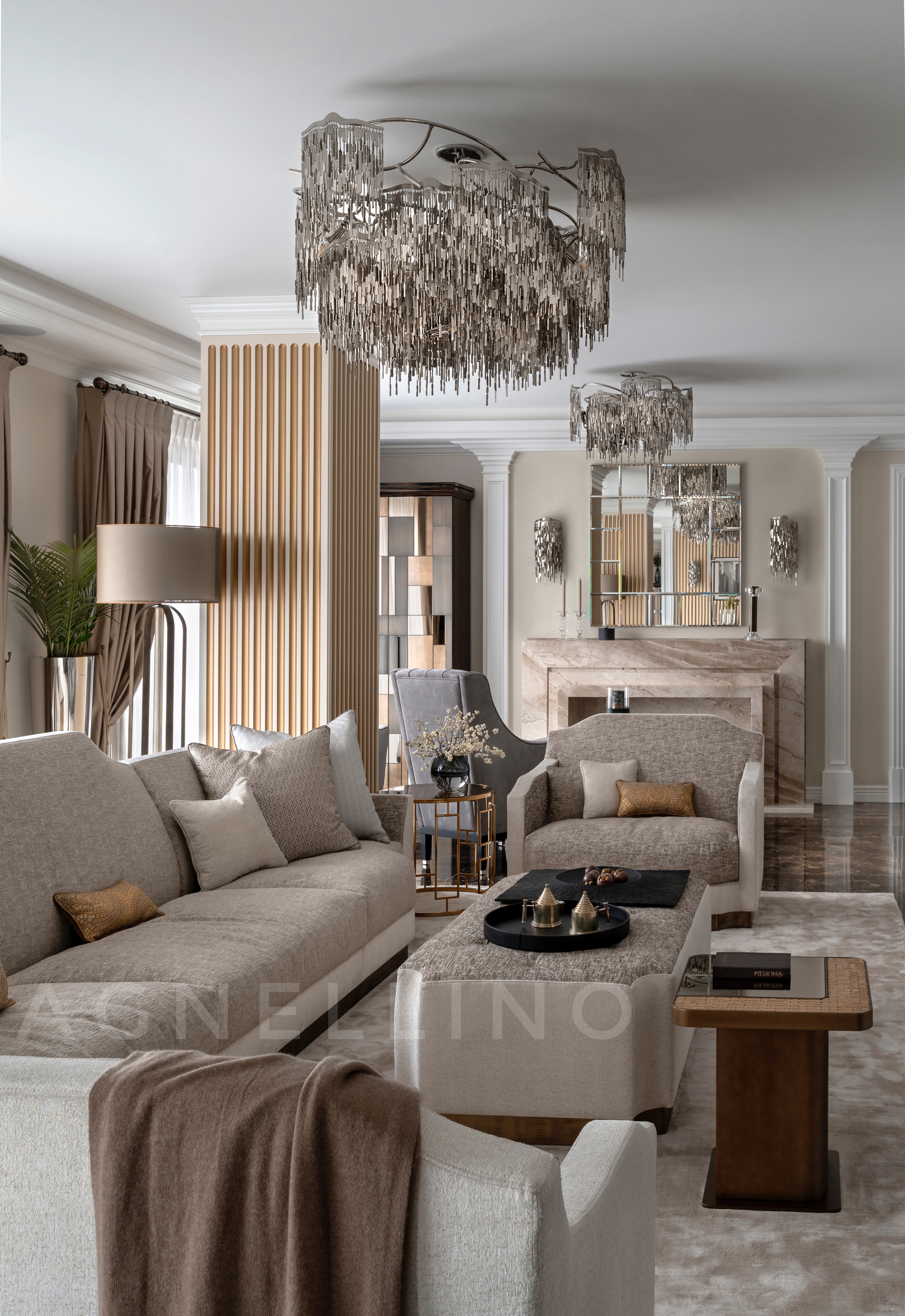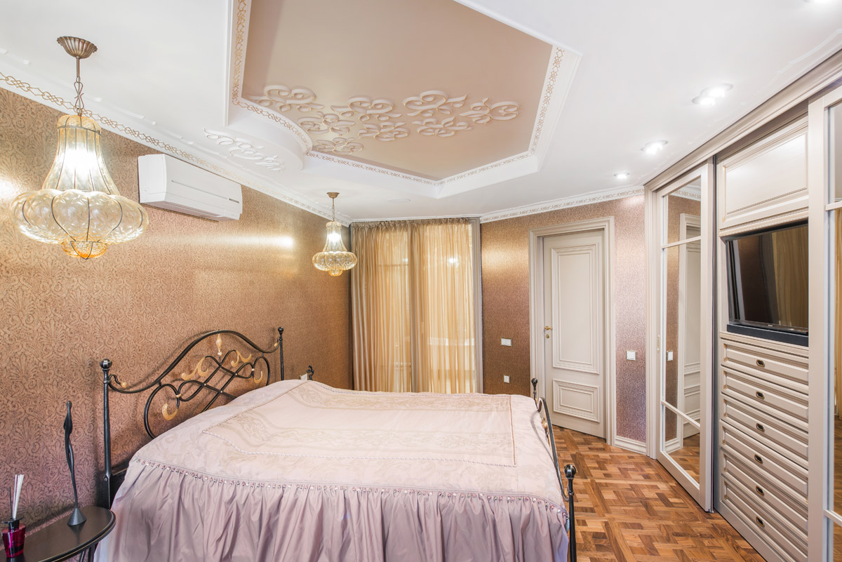 Цвета подобраны соответственно: золотой, шоколадный, слоновая кость, жемчужно-серые оттенки. Симметрия линий, баланс и гармония форм, симбиоз текстур хрусталя, бронзы, набука, шелка, лакированного дерева, оникса и мрамора. Интерьер апартаментов выполнен в классическом стиле: просторная гостиная с каминной зоной, столовая и отдельная кухня в стиле роскошных яхтенных интерьеров. Большая светлая спальня имеет отдельную гардеробную, ванную комнату и СПА-зону, украшенную большим панно с вышивкой в восточном духе. И особая роль здесь отводится работе с декоративным камнем: оникс с подсветкой, узоры из эмперадора на полу, сложные решения из каррарского мрамора и травертина в СПА-зоне и ванной комнате.