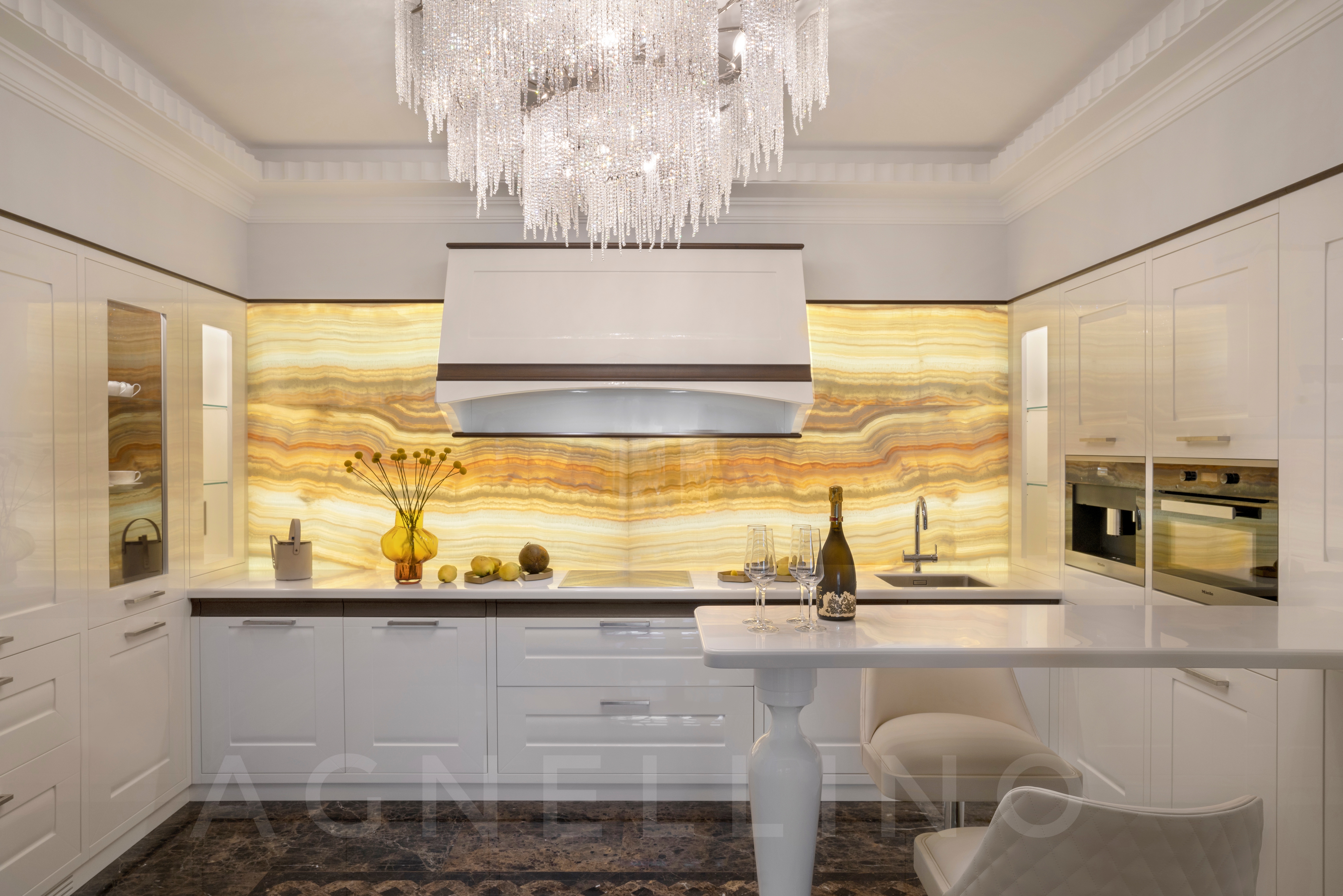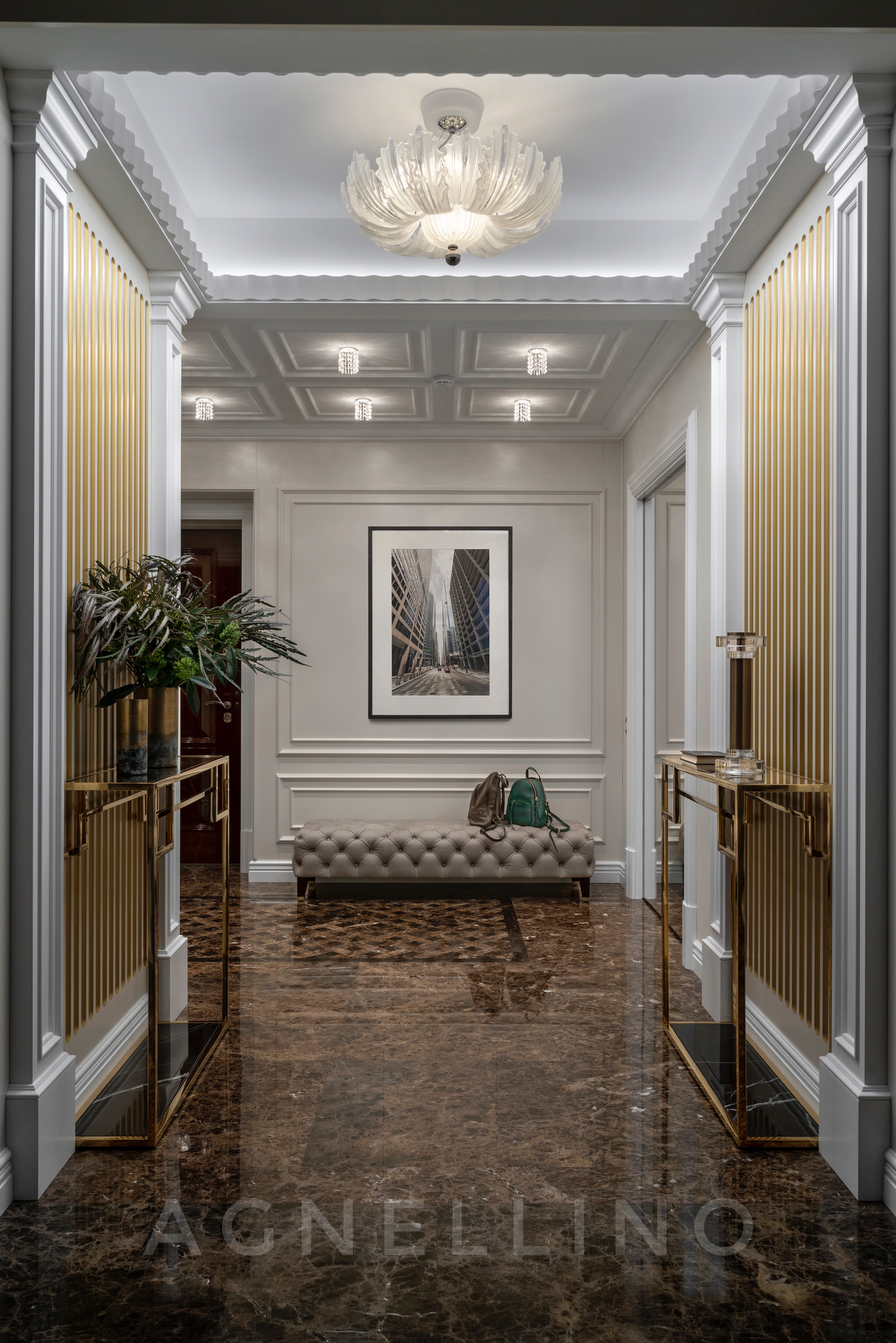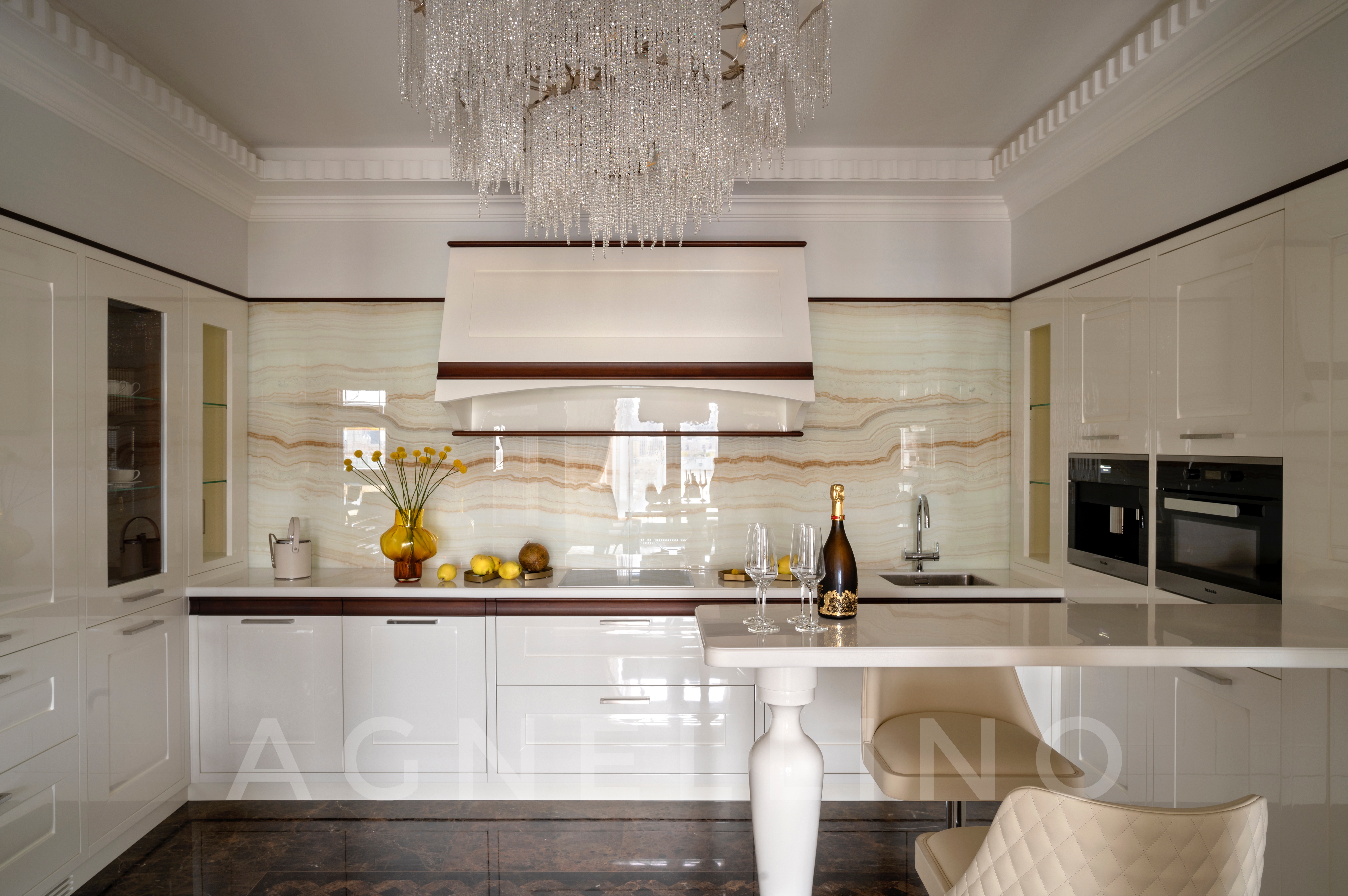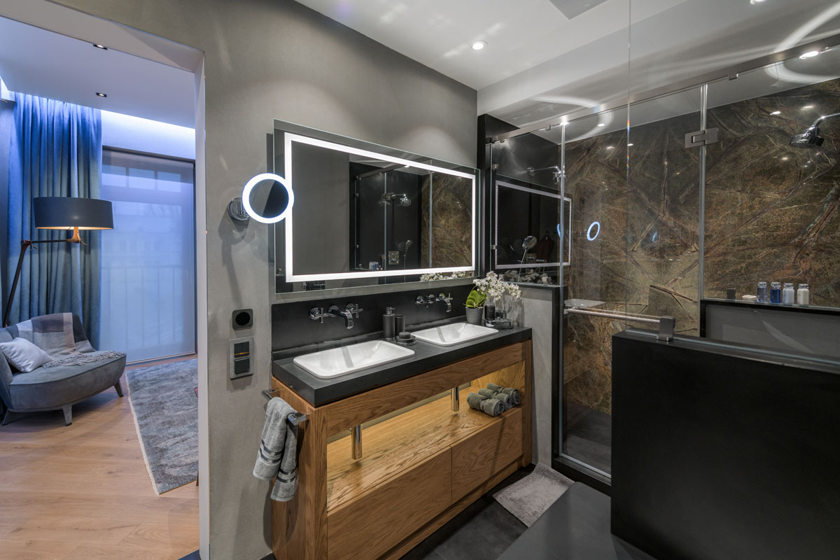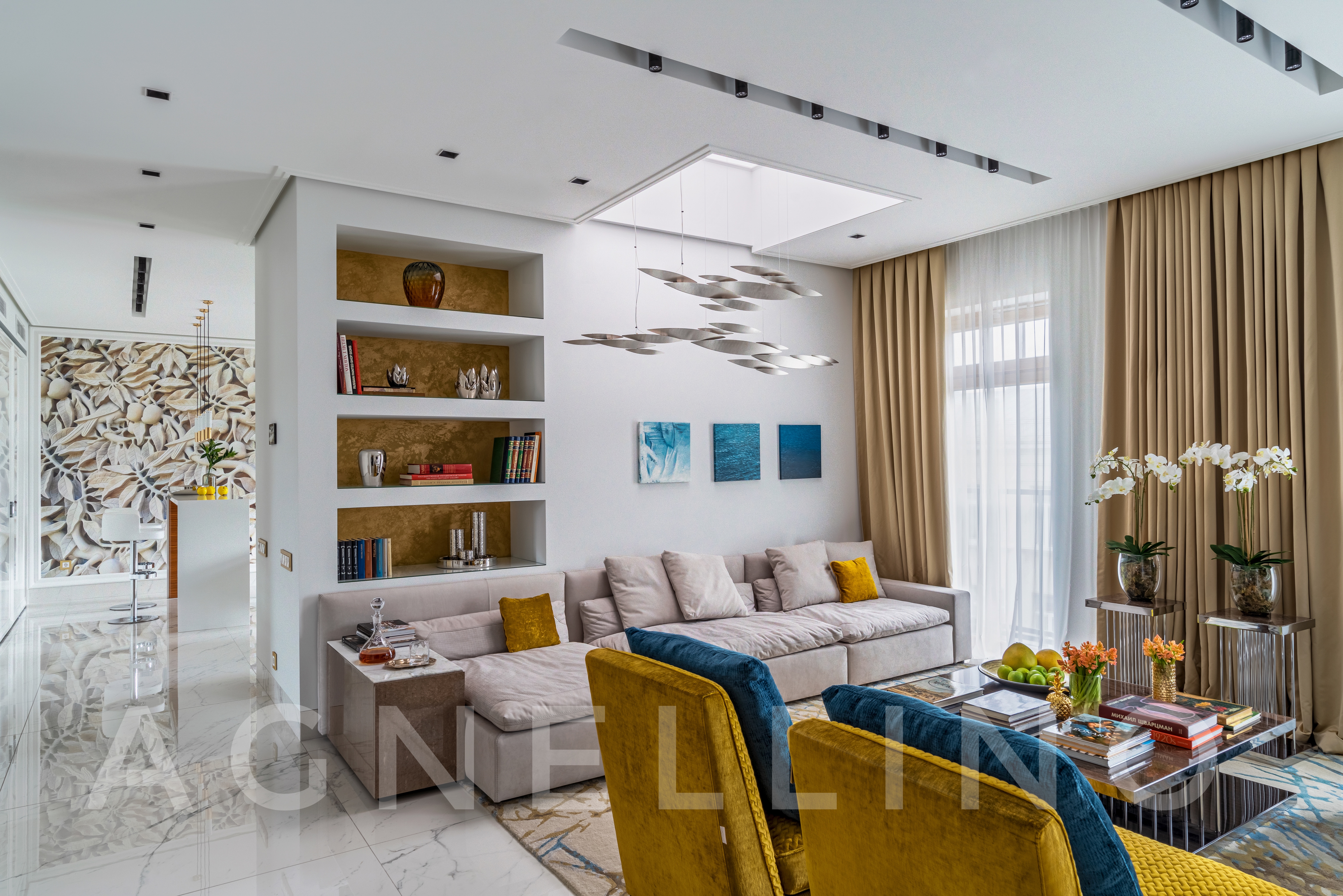 Цвета подобраны соответственно: золотой, шоколадный, слоновая кость, жемчужно-серые оттенки. Симметрия линий, баланс и гармония форм, симбиоз текстур хрусталя, бронзы, набука, шелка, лакированного дерева, оникса и мрамора. Интерьер апартаментов выполнен в классическом стиле: просторная гостиная с каминной зоной, столовая и отдельная кухня в стиле роскошных яхтенных интерьеров. Большая светлая спальня имеет отдельную гардеробную, ванную комнату и СПА-зону, украшенную большим панно с вышивкой в восточном духе. И особая роль здесь отводится работе с декоративным камнем: оникс с подсветкой, узоры из эмперадора на полу, сложные решения из каррарского мрамора и травертина в СПА-зоне и ванной комнате.