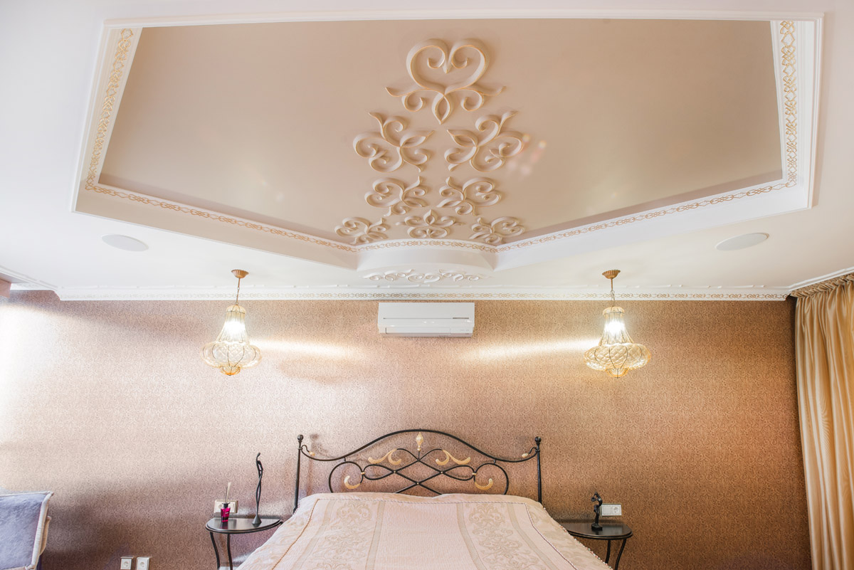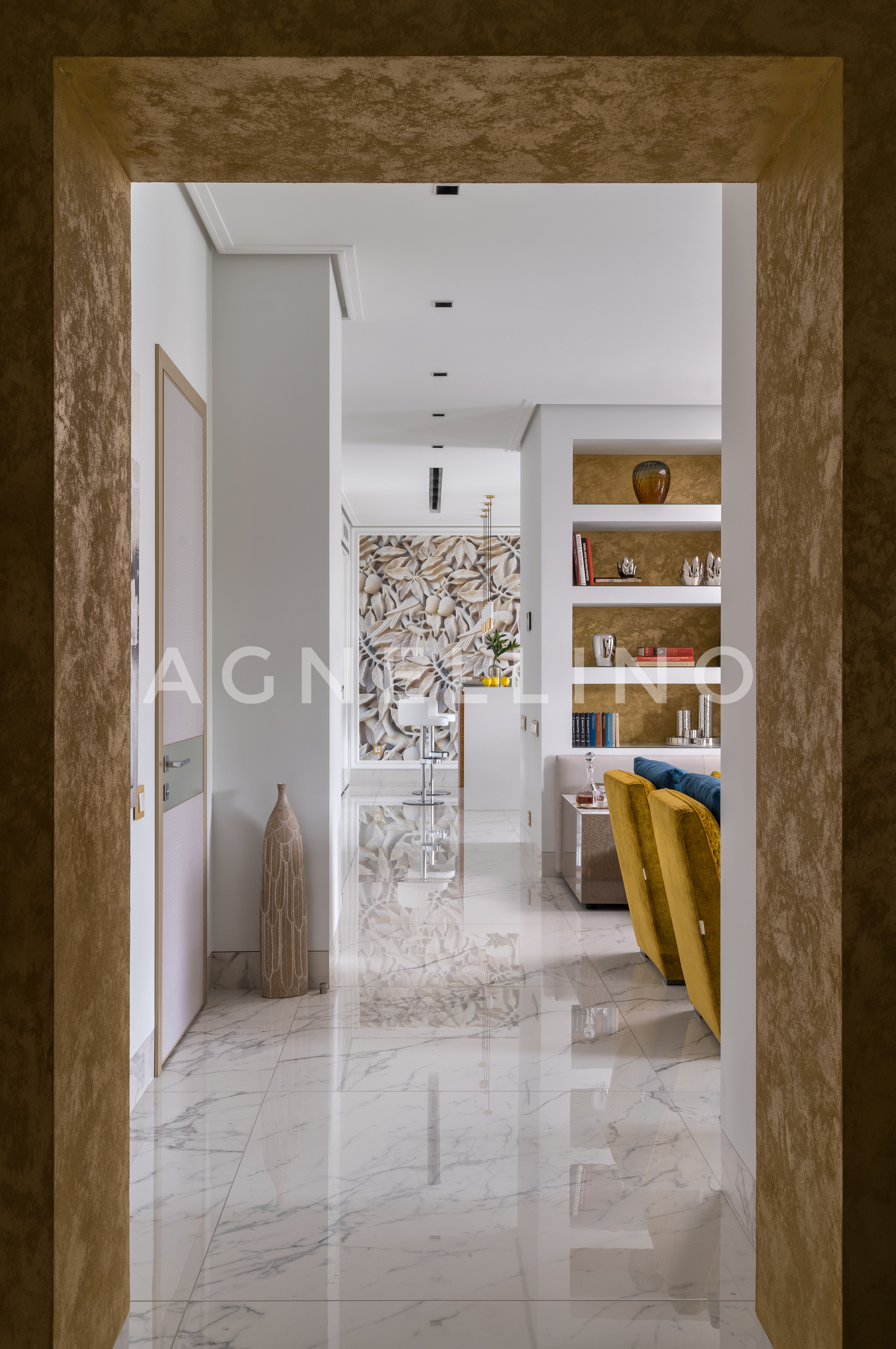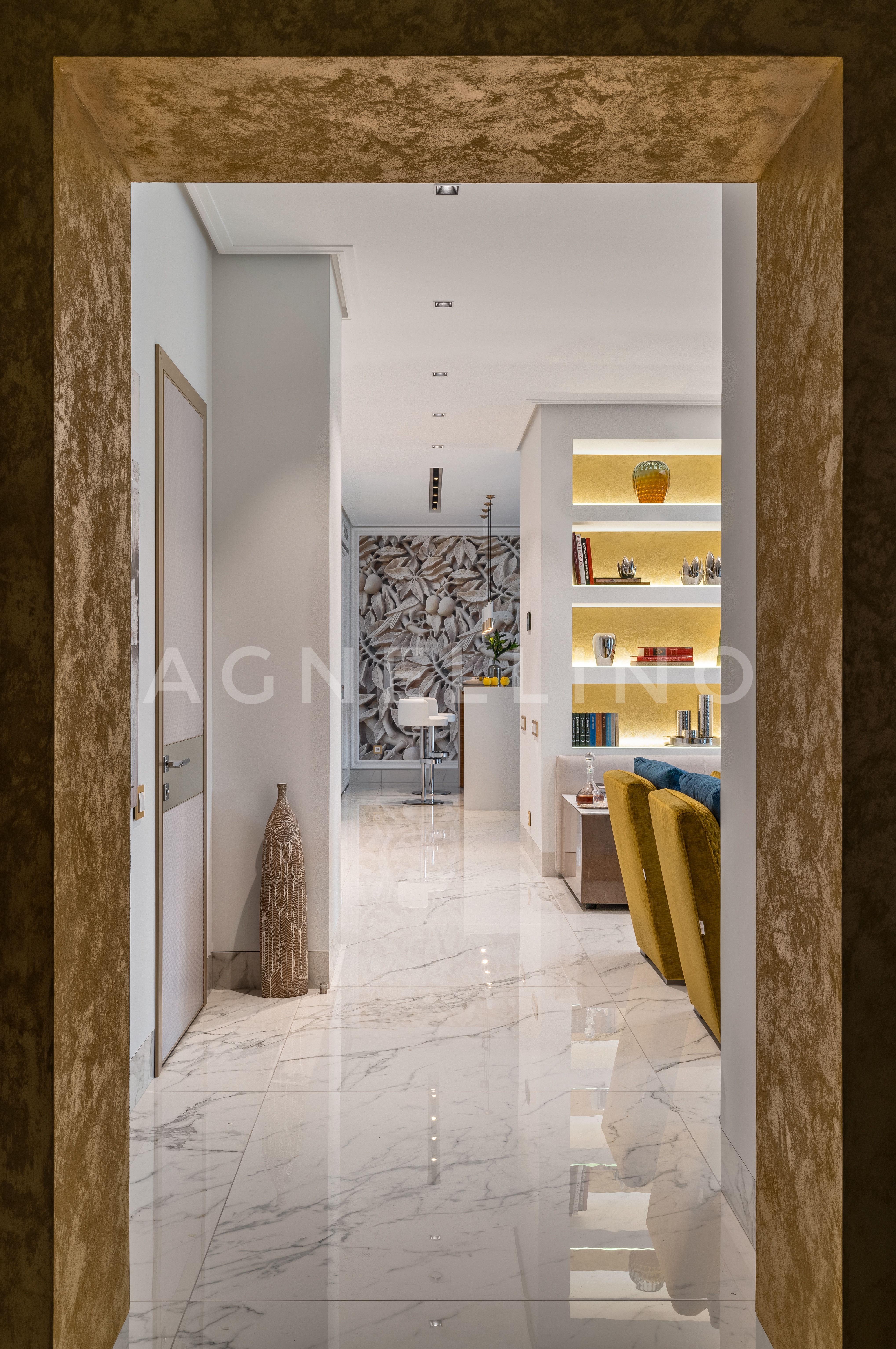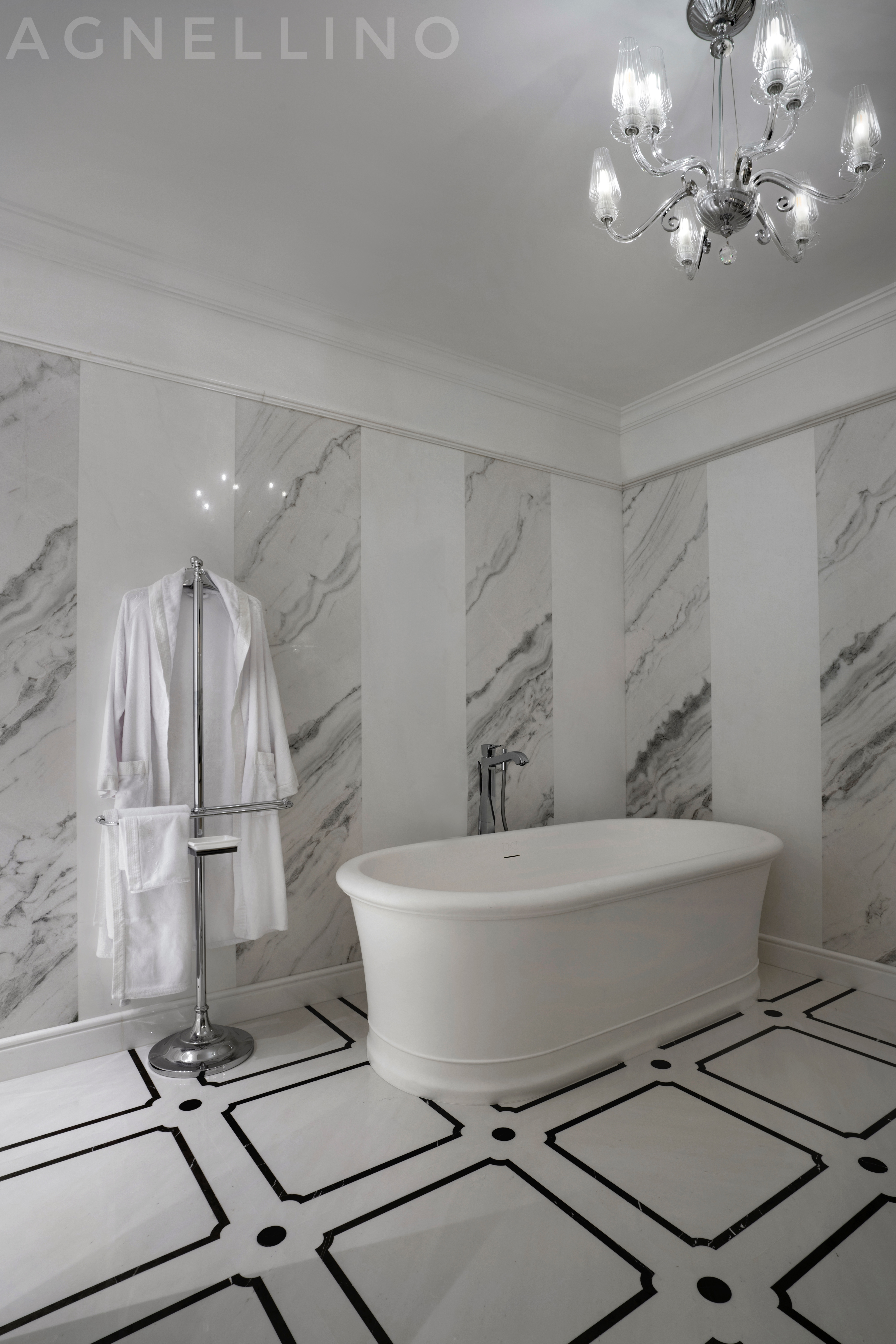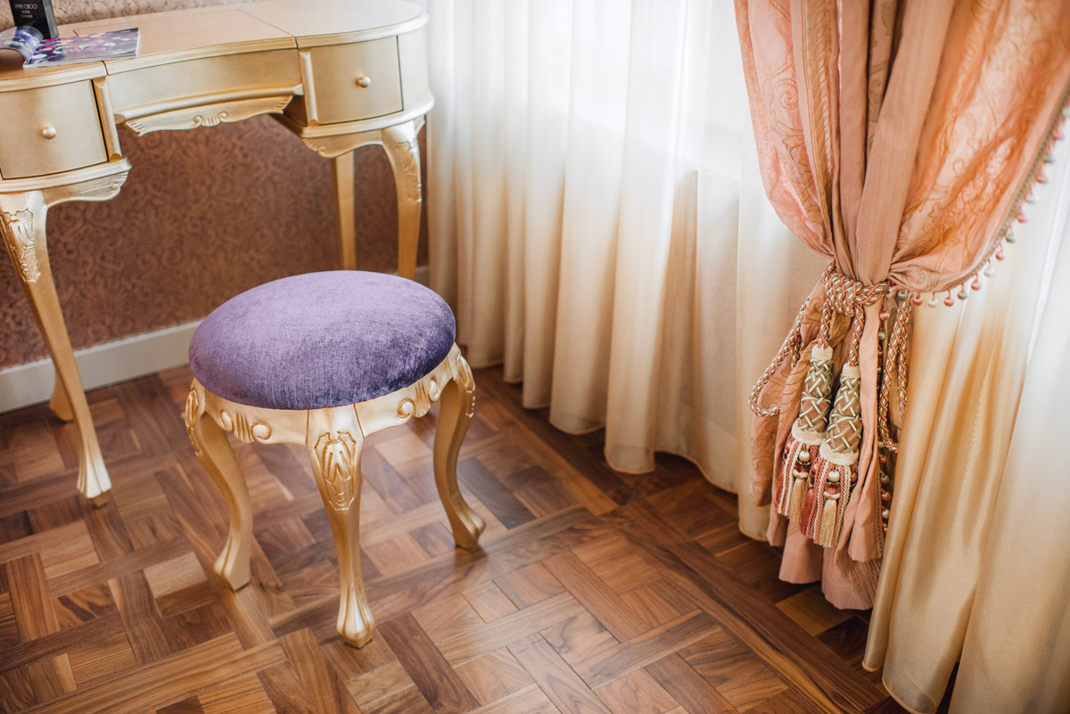 Цвета подобраны соответственно: золотой, шоколадный, слоновая кость, жемчужно-серые оттенки. Симметрия линий, баланс и гармония форм, симбиоз текстур хрусталя, бронзы, набука, шелка, лакированного дерева, оникса и мрамора. Интерьер апартаментов выполнен в классическом стиле: просторная гостиная с каминной зоной, столовая и отдельная кухня в стиле роскошных яхтенных интерьеров. Большая светлая спальня имеет отдельную гардеробную, ванную комнату и СПА-зону, украшенную большим панно с вышивкой в восточном духе. И особая роль здесь отводится работе с декоративным камнем: оникс с подсветкой, узоры из эмперадора на полу, сложные решения из каррарского мрамора и травертина в СПА-зоне и ванной комнате.