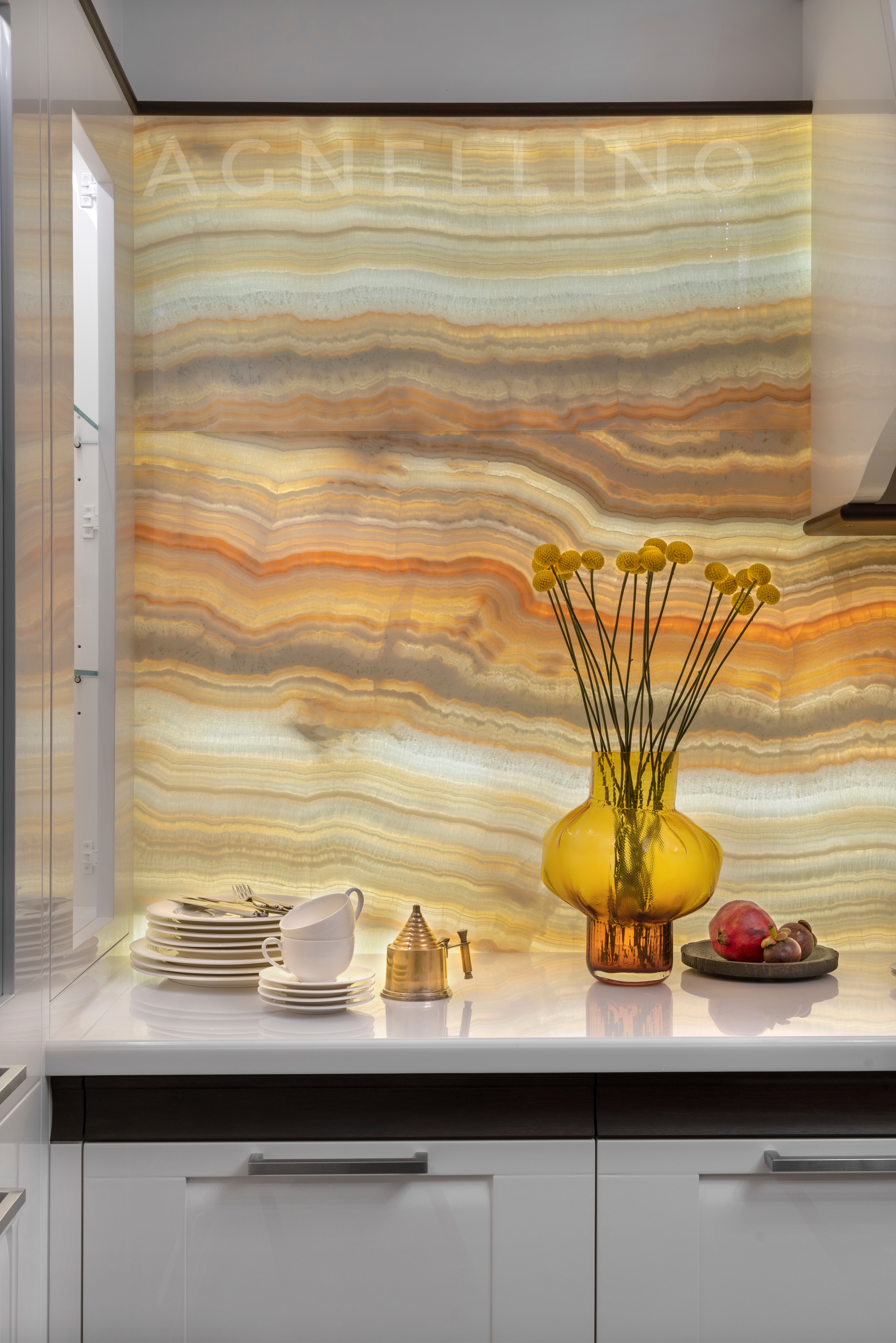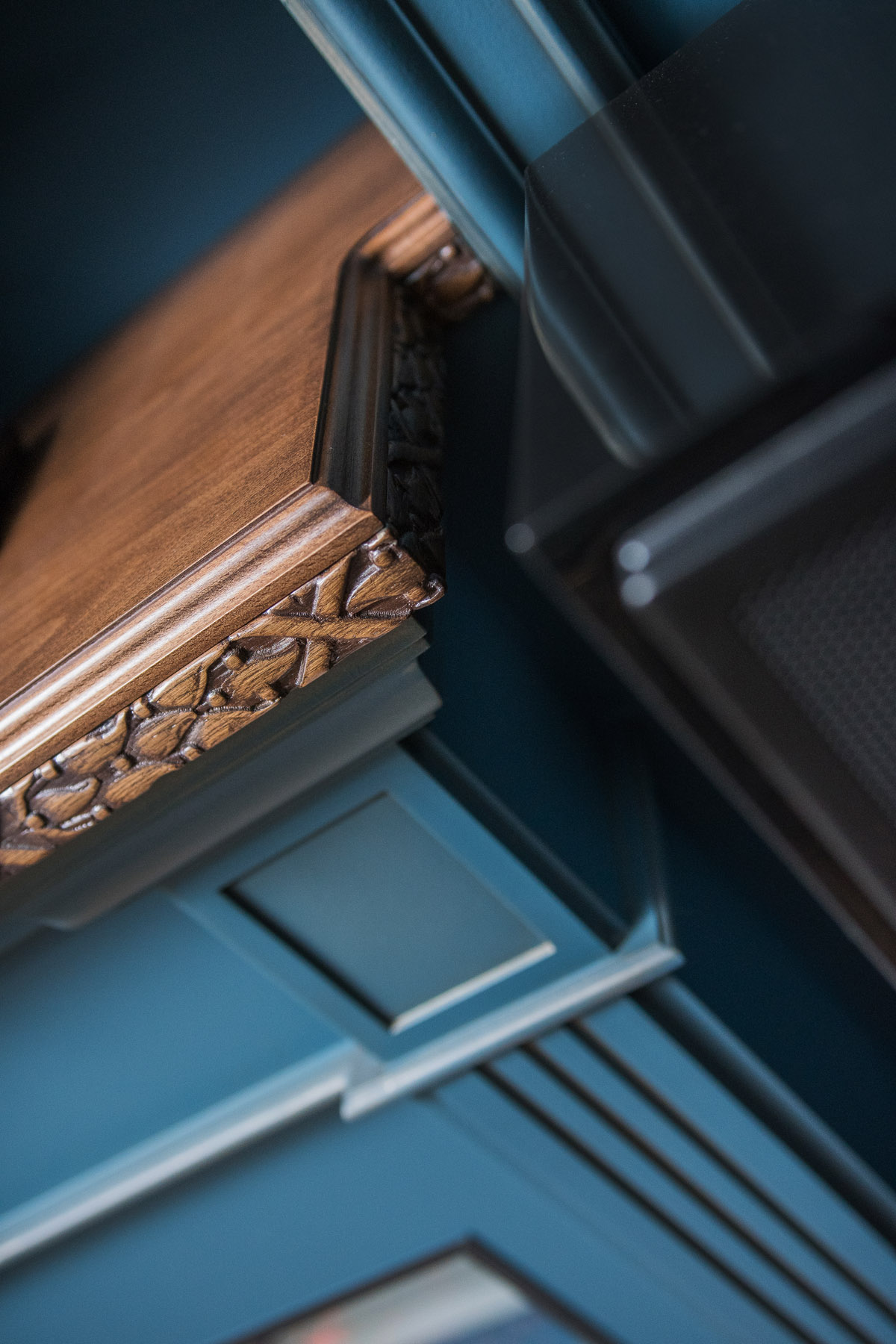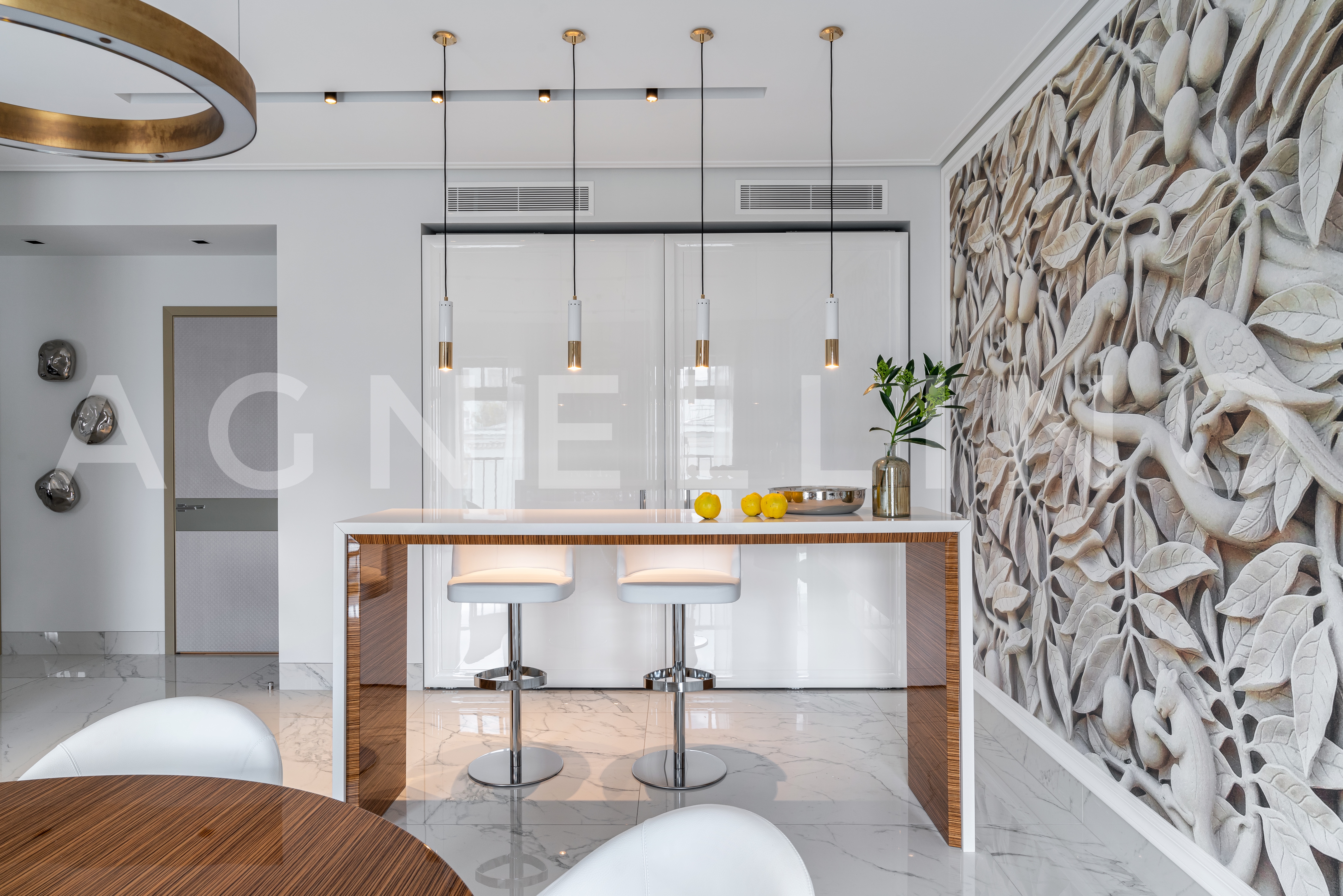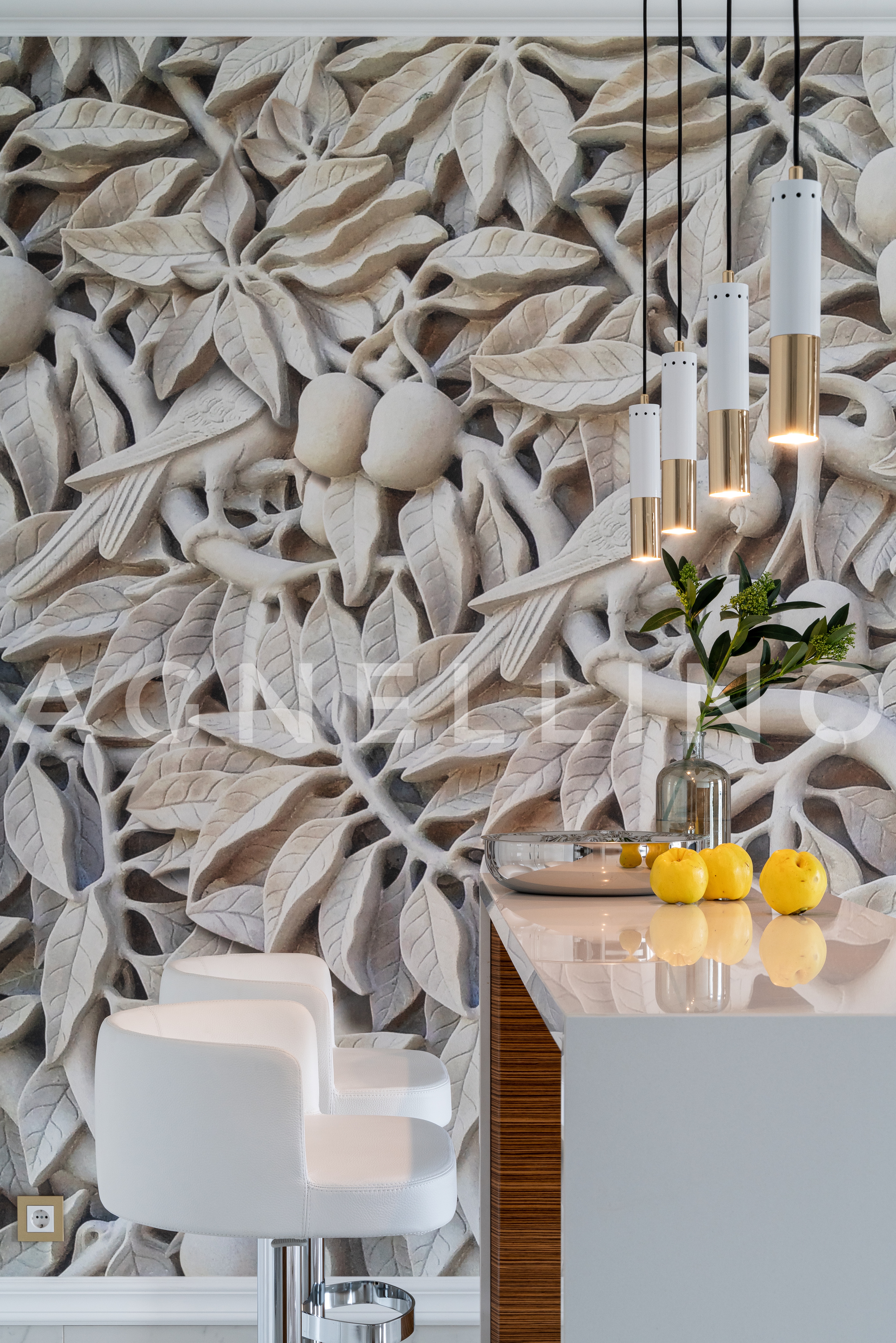 Главный декоративный акцент пришёлся на зону кухни–столовой. Именно здесь находится знаковый элемент интерьера — шестиметровая фреска на видовой стене, постепенно раскрывающаяся по мере приближения к ней сквозь анфиладу помещений и задуманная как некая «награда для глаз»: резные листья и плоды, диковинные птицы в ветвях — рассматривать их можно бесконечно…