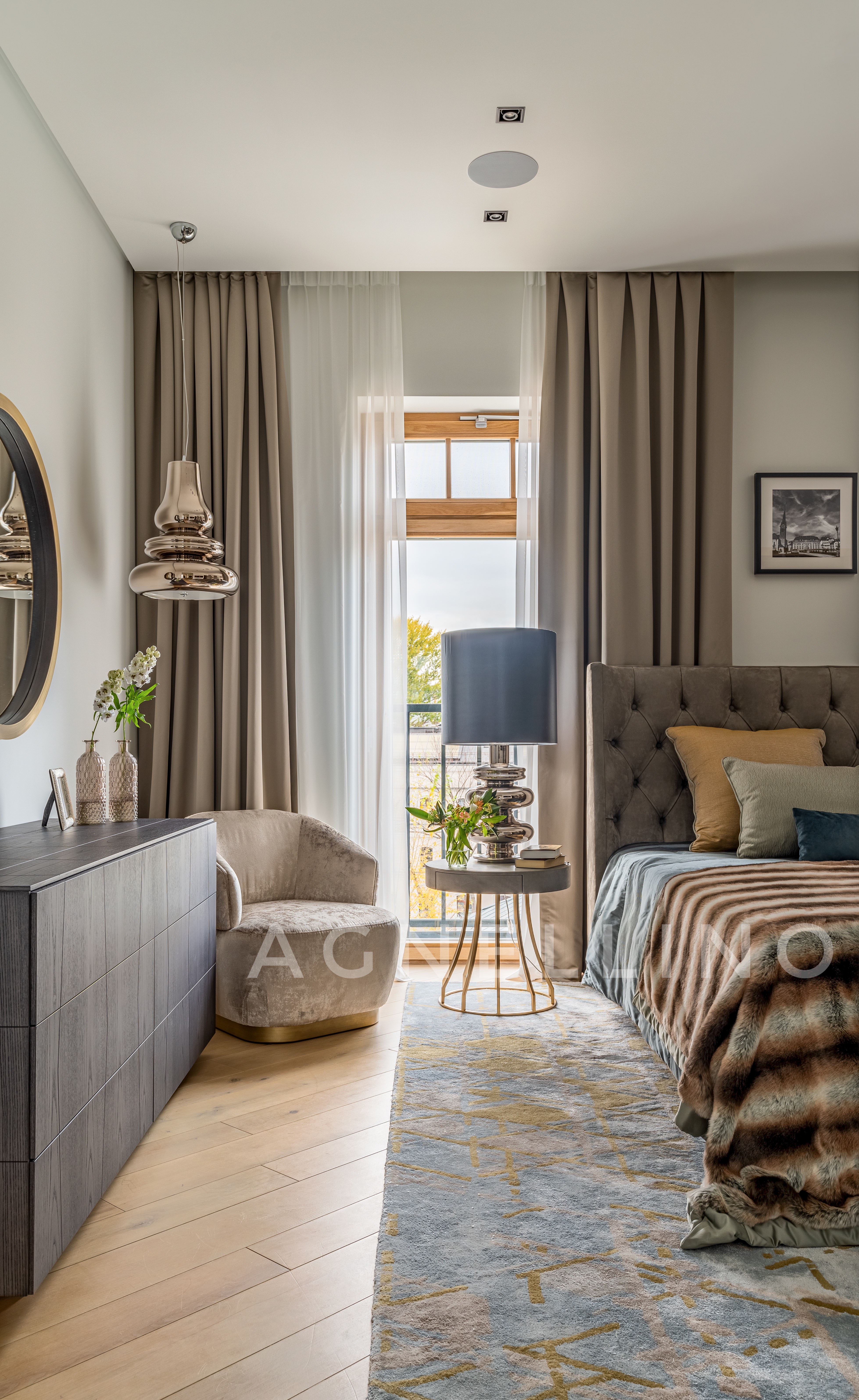 Эксклюзивные ковры смягчают четкую графику и прямые линии мебели и стен, в гостиной и столовой зоне они нивелируют блеск стеклянных и металлических поверхностей… И настоящей изюминкой проекта стало напольное зеркало в гардеробной – его рама изготовлена из бережно сохраненной деревянной балки, она коренная жительница этого дома!