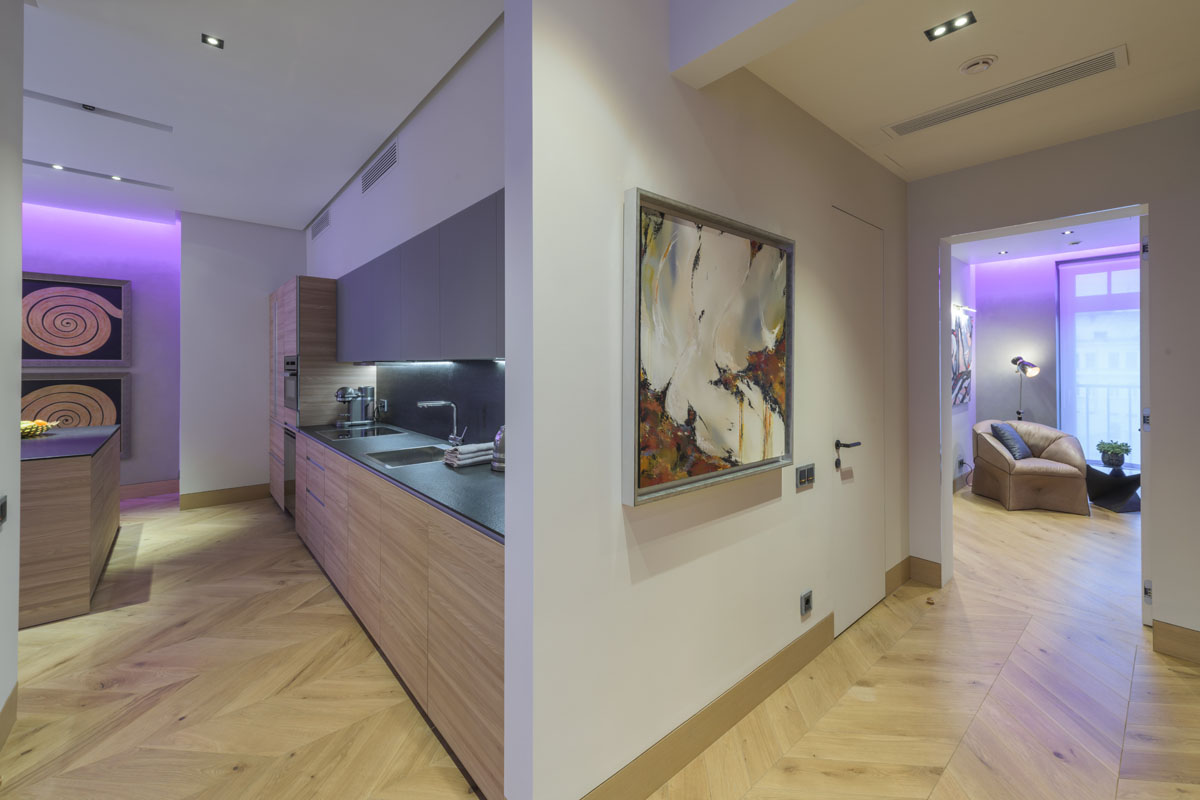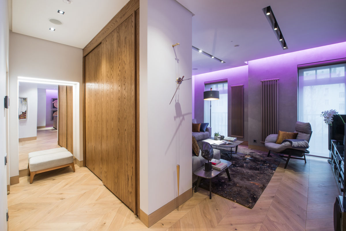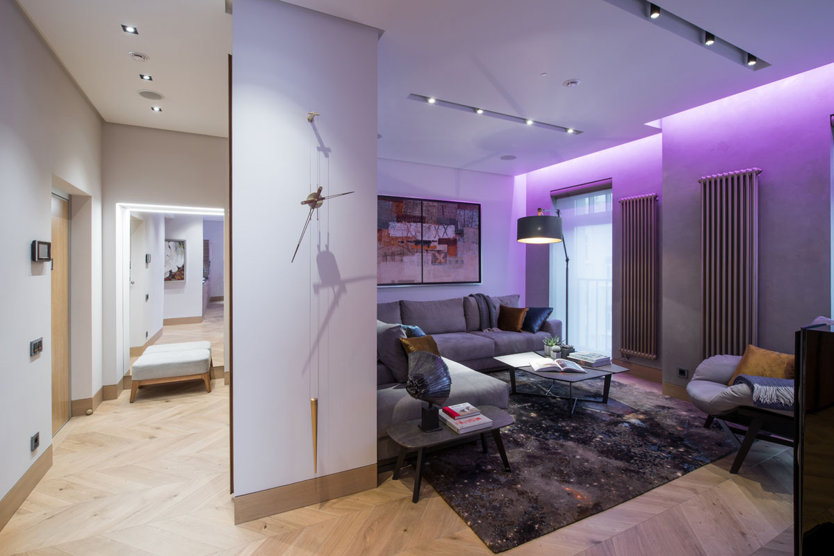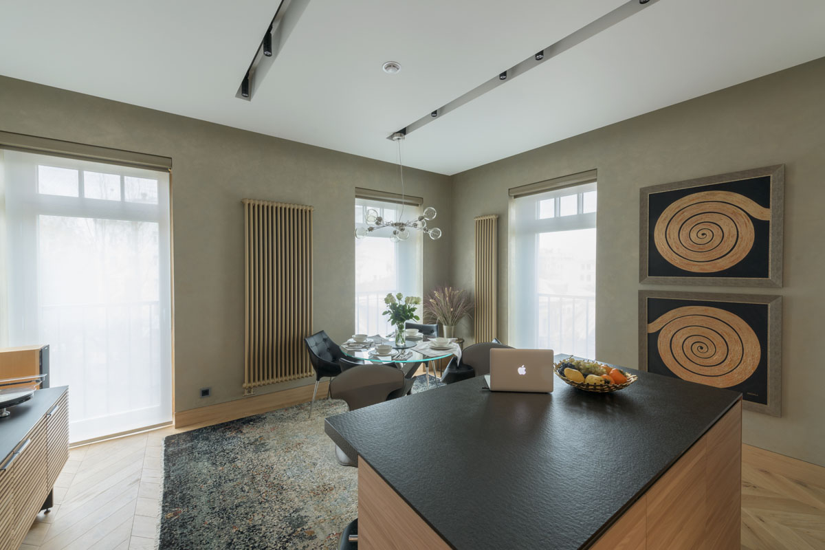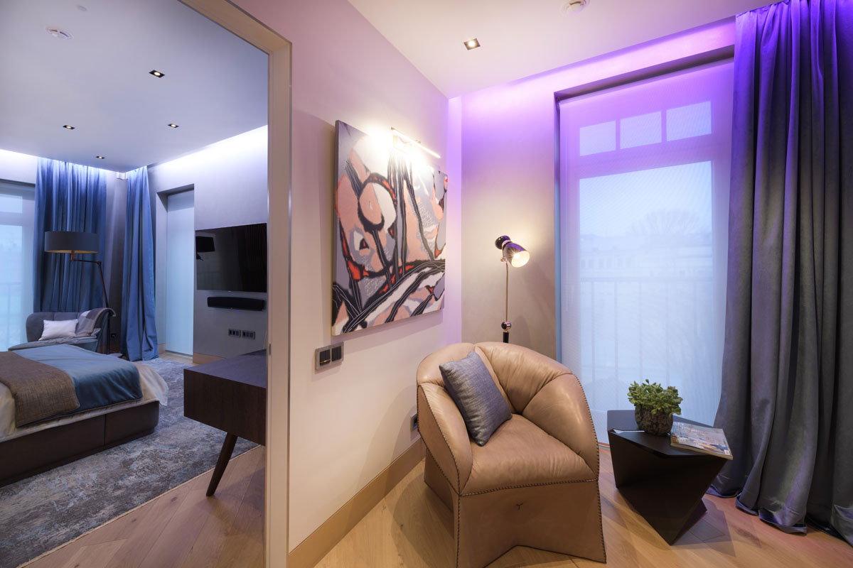 Бутик-отель расположенный в историческом центре Москвы и в историческом здании после реновации имеет в своей концепции эко-лофтовое решение. Создавая интерьер апартаментов мы хотели сохранить этот общий дух отеля и развить его до определенной статусности. Большую роль здесь сыграл и вкус заказчика, и его искушенность в современном искусстве. Картины тщательно подбирались таким образом, чтобы придать особое звучание и исключительность каждому пространству в апартаментах.