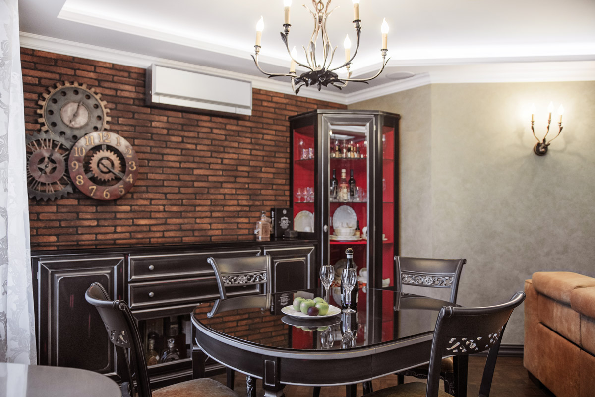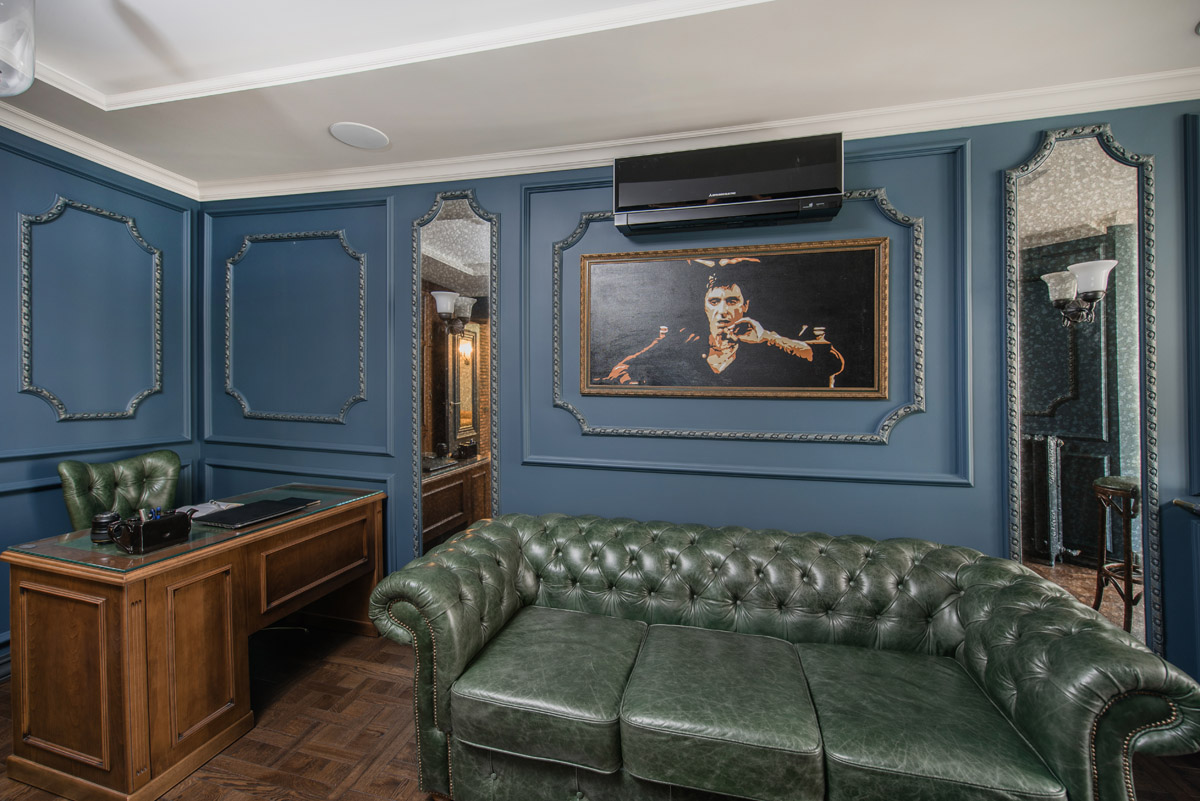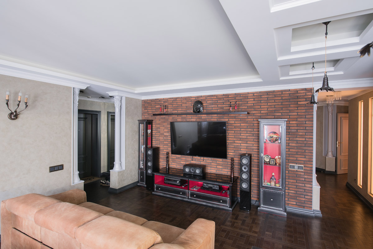 Для создания исторической атмосферы мы использовали особую кирпичную кладку на стенах, светильники с патинированной бронзой, словно бы от влаги состаренные зеркала, высокие чугунные радиаторы на лапах и с деревянными вентилями… В проекте использованы современные технологии: домашний кинотеатр, диодная подсветка, система звука мультирум со встроенной в потолки акустикой, установлен камин с плазменным экраном системы 5D.