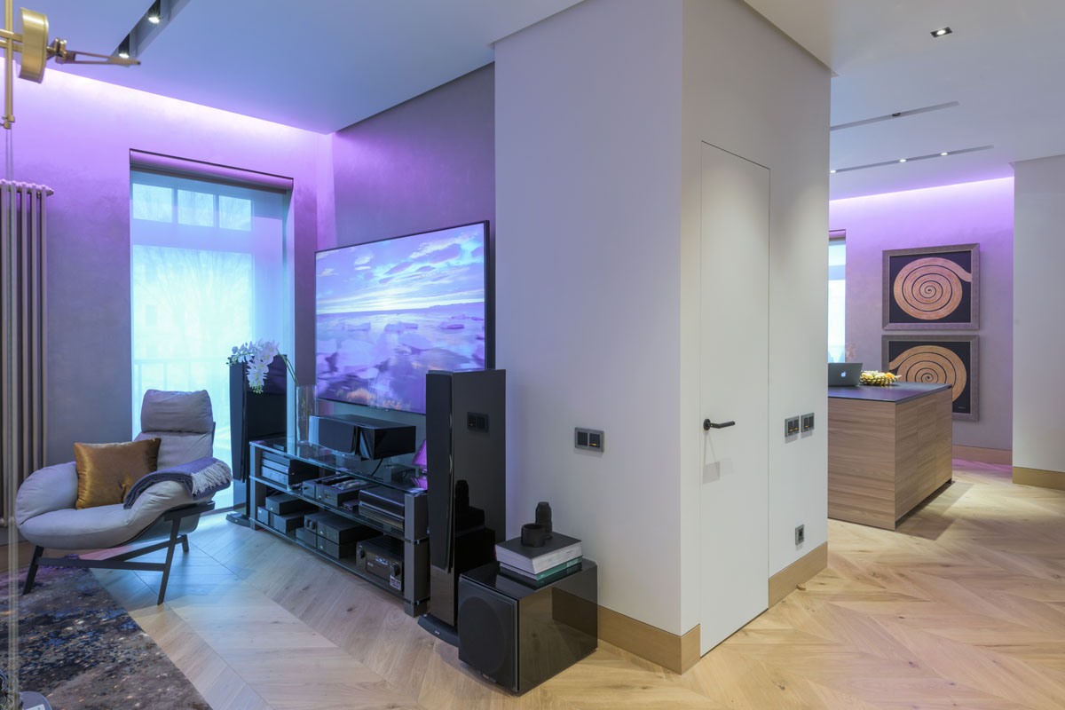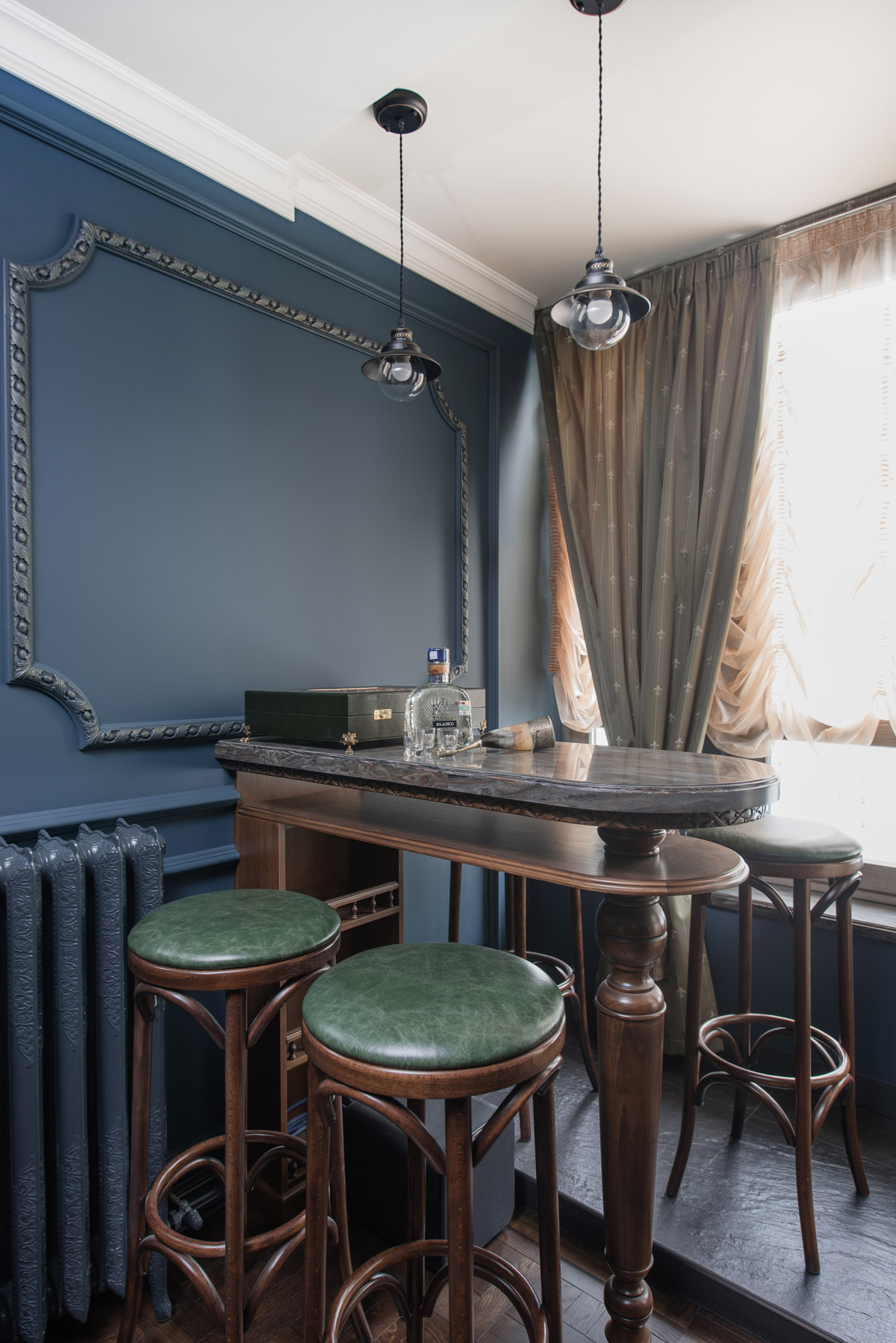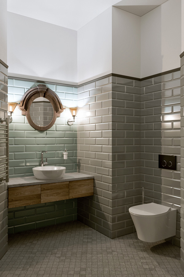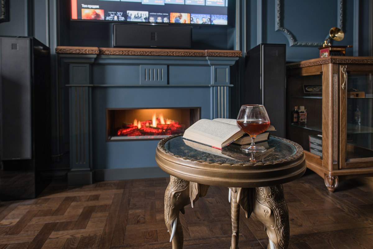 Для создания исторической атмосферы мы использовали особую кирпичную кладку на стенах, светильники с патинированной бронзой, словно бы от влаги состаренные зеркала, высокие чугунные радиаторы на лапах и с деревянными вентилями… В проекте использованы современные технологии: домашний кинотеатр, диодная подсветка, система звука мультирум со встроенной в потолки акустикой, установлен камин с плазменным экраном системы 5D.