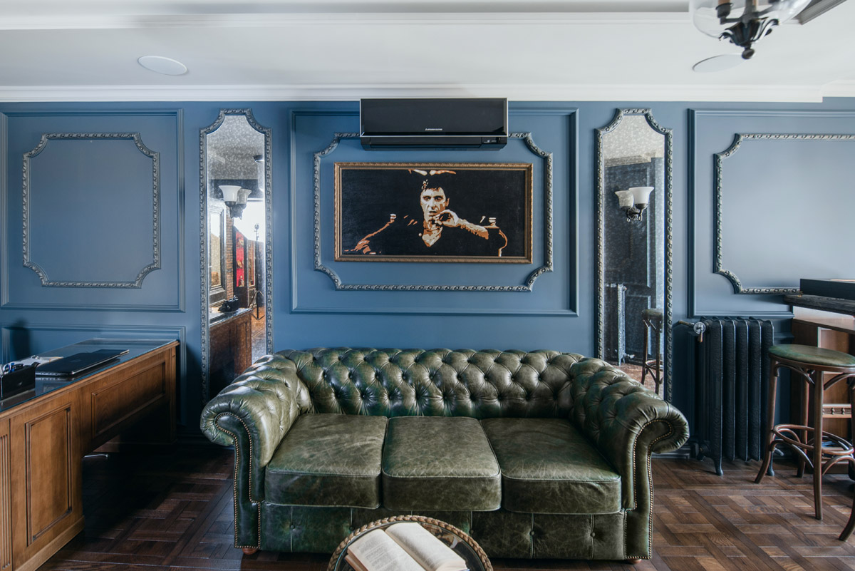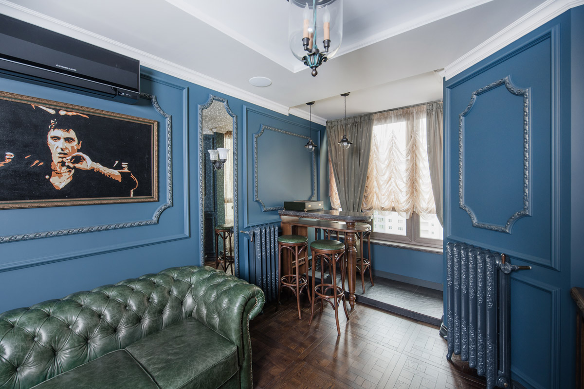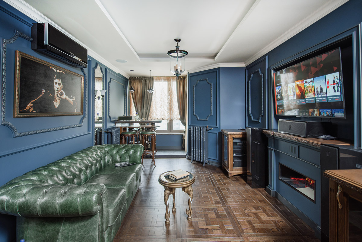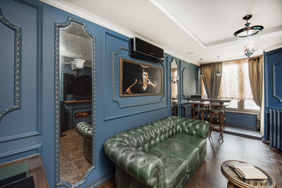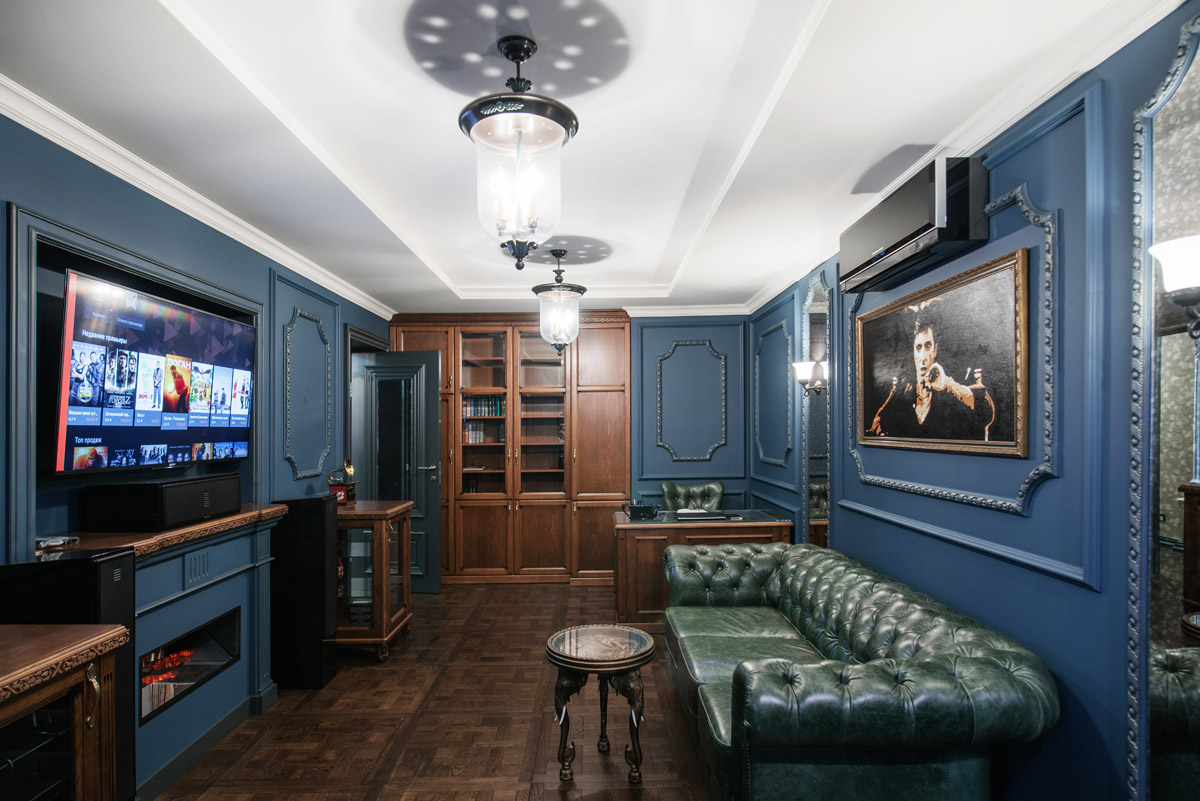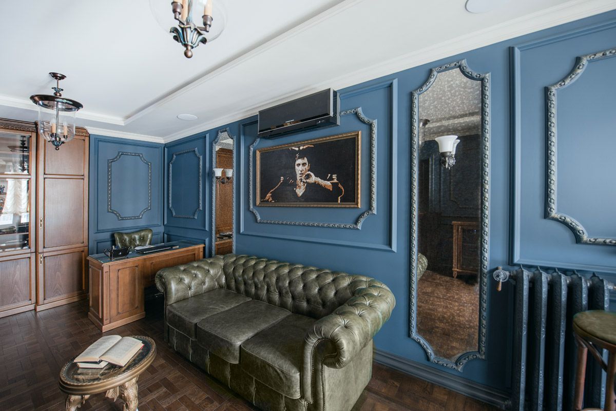 Идея сочетать два разных стиля изначально принадлежала хозяину квартиры с восточными корнями. Он как приверженец английской классики мечтал о кабинете для мужских посиделок у камина и о большой семейной гостиной с традиционным сервантом и часами. Приватная же зона планировалась в духе арабской сказки с теплой, закатной атмосферой и обилием позолоты.