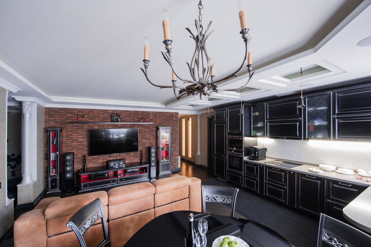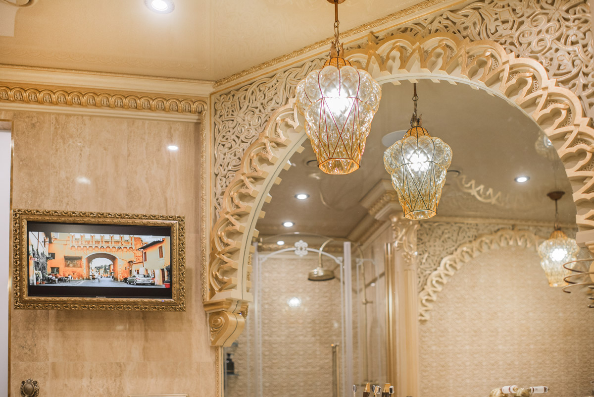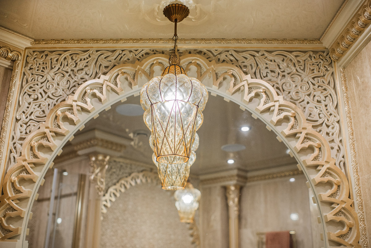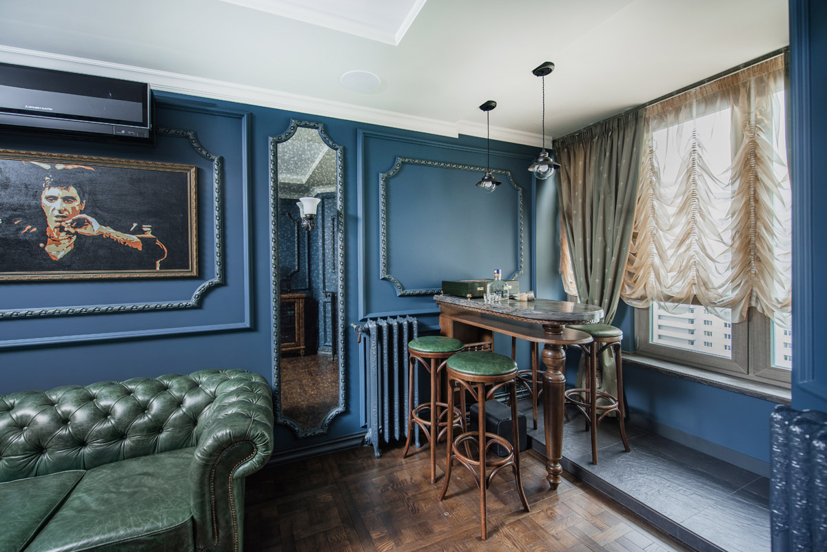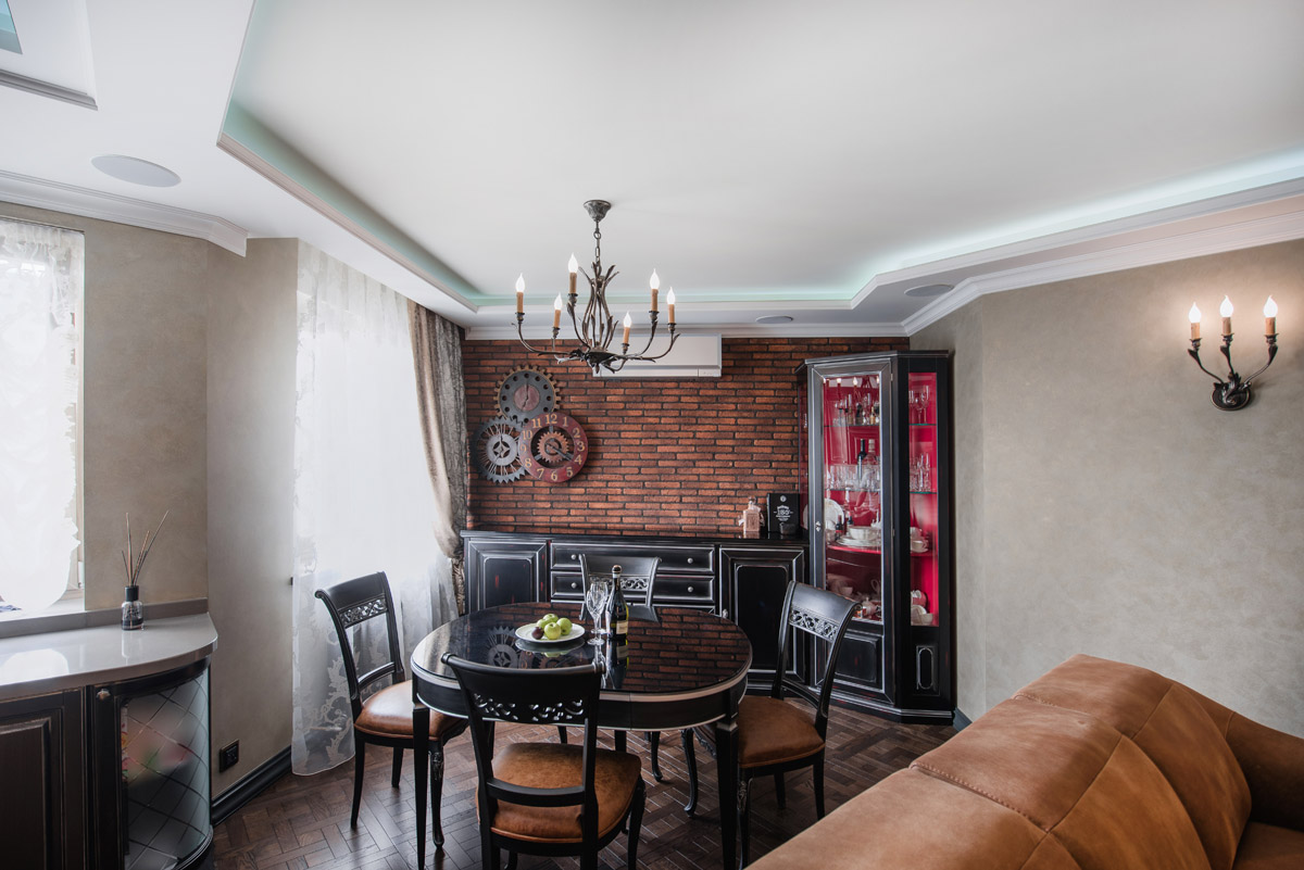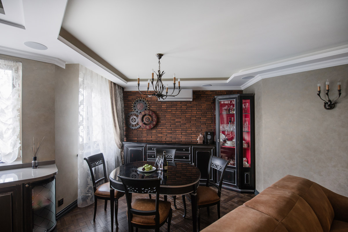 Идея сочетать два разных стиля изначально принадлежала хозяину квартиры с восточными корнями. Он как приверженец английской классики мечтал о кабинете для мужских посиделок у камина и о большой семейной гостиной с традиционным сервантом и часами. Приватная же зона планировалась в духе арабской сказки с теплой, закатной атмосферой и обилием позолоты.