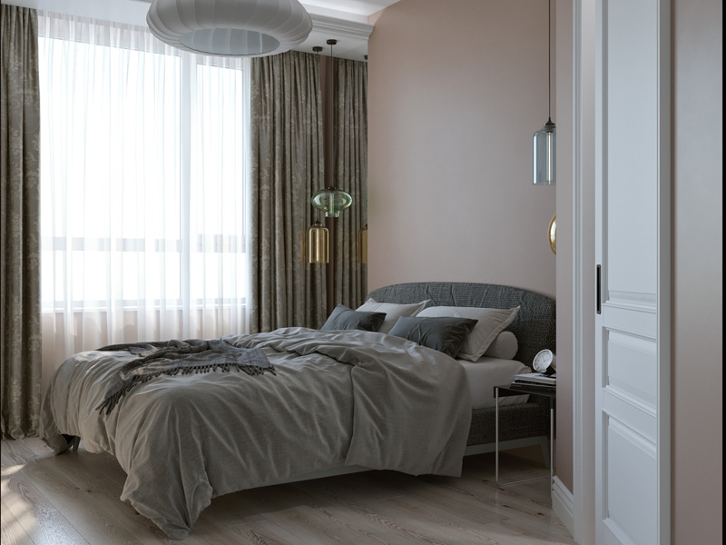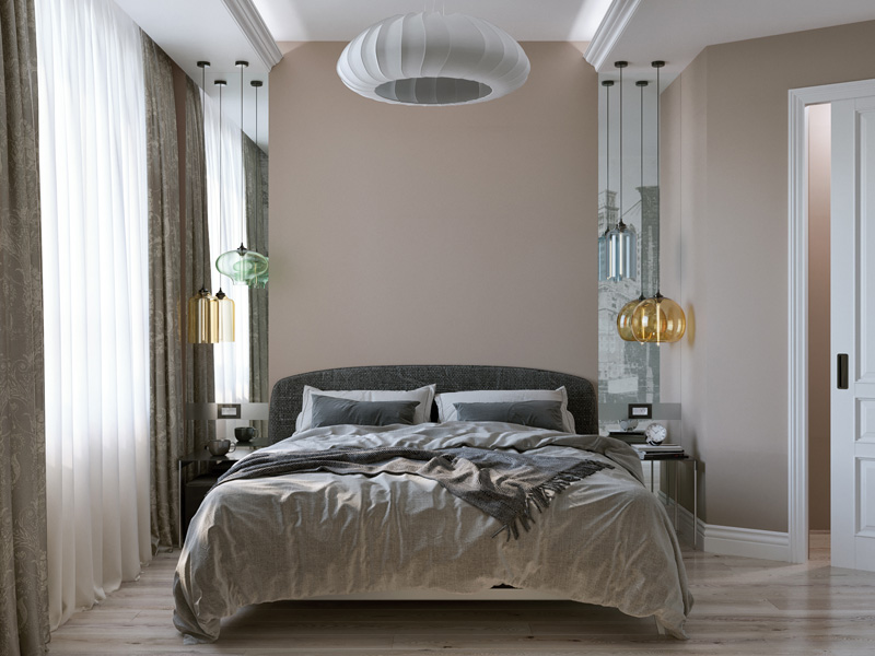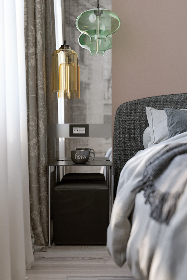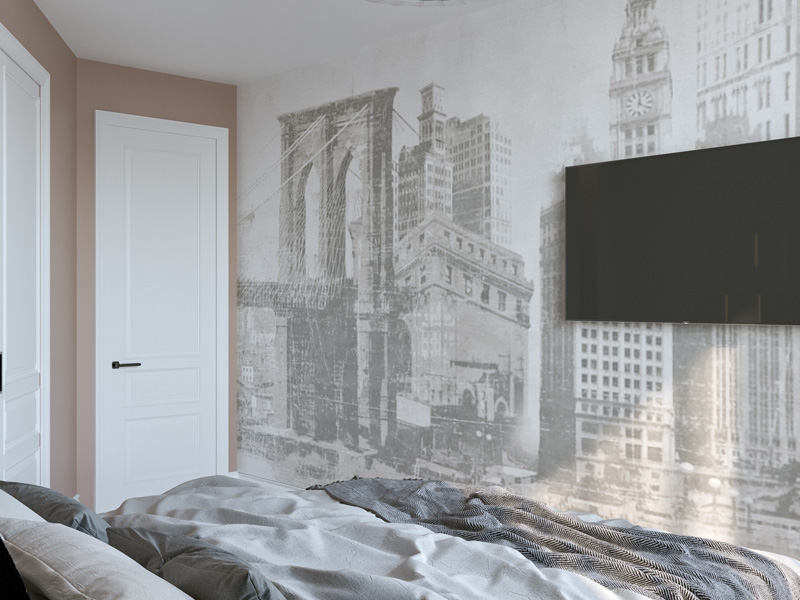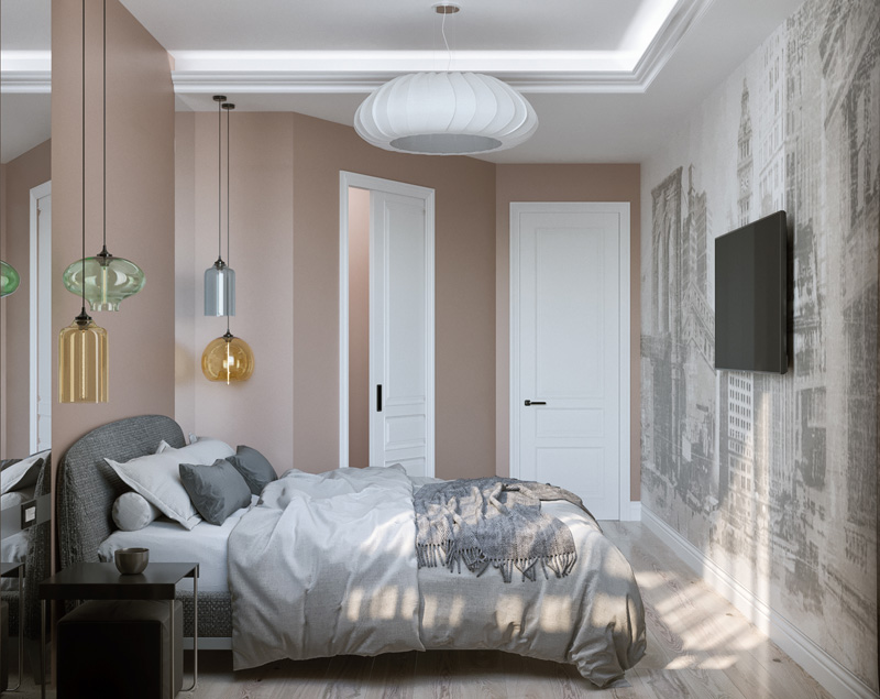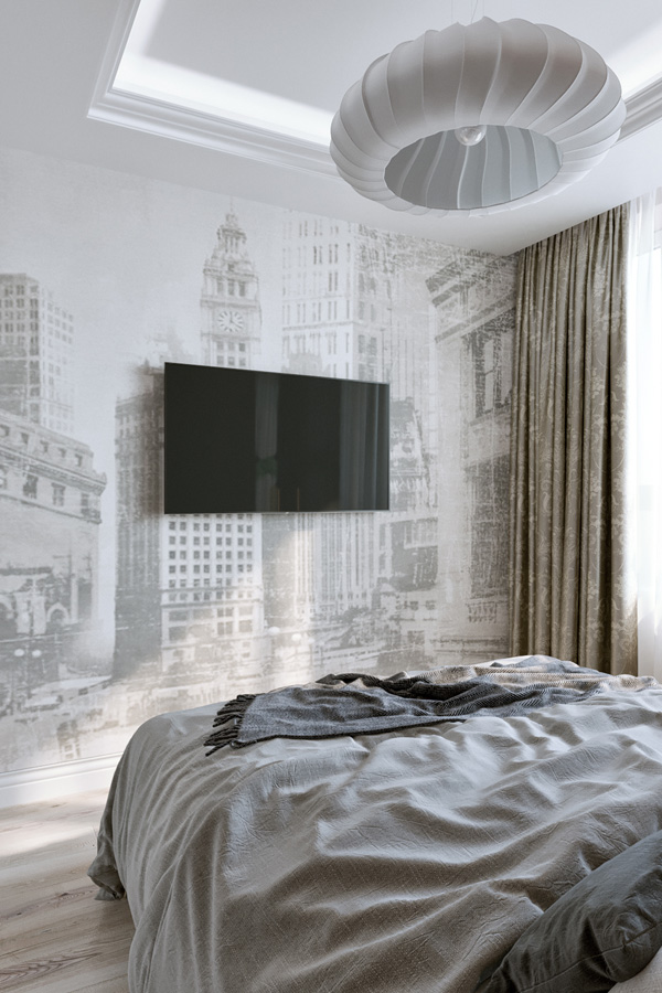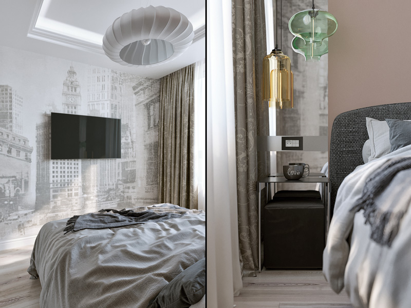 В спальне мы использовали прием для расширения узкого пространства – фреску во всю стену. Изображением городской среды словно раздвигает границы комнаты. Современные цветные стеклянные подвесы отражаясь в зеркальных простенках придают интерьеру спальни актуальное звучание.