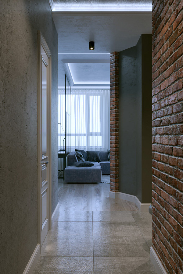 Объем представлял собой обычную распашонку и предстал перед нами во всей своей первозданной бетонной красоте. На этапе планировочного решения был добавлен еще один санузел, присоединили балкон – на нем оборудовали столовую, появилась зона кабинета и две небольших гардеробные. Изюминкой пространства стало диагональное решение общей зоны с акцентными стенами из состаренного кирпича.